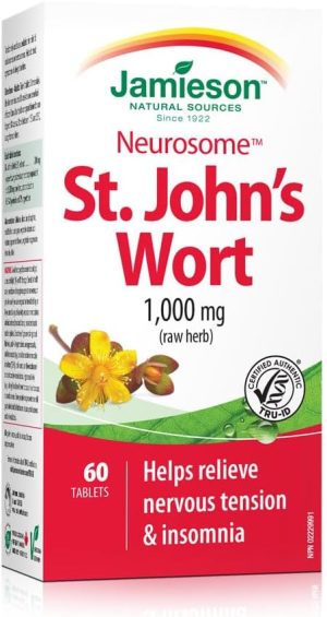 Jamieson St. John’s Wort 1,000 mg, Neurosome, Calming, and Helps Relieve Nervousness. Non-GMO, Gluten-Free, 60 Tablets, Proudly Canadian