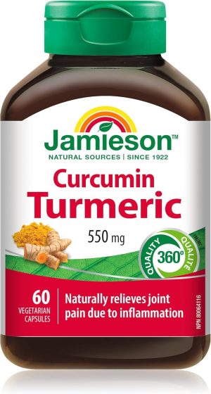 Jamieson Curcumin Turmeric 550 mg, Provides Natural Joint Pain Relief, Supports Inflammation, and Helps with Digestion. NON-GMO, Gluten-Free, 60 Vegetarian Capsules, Proudly Canadian