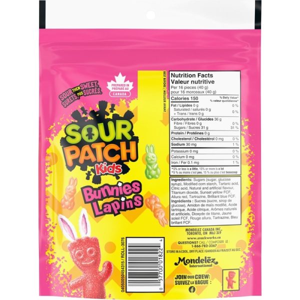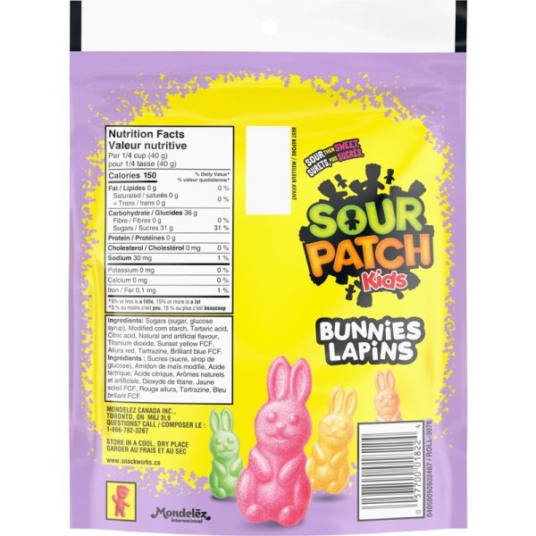 - This pack contains one resealable 315 g bag of MAYNARDS Sour Patch Kids Bunnies candy. Prepared in Canada