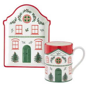 Spode Christmas Tree Collection, Christmas Village Mug & Tidbit Tray Set, 4-piece Green