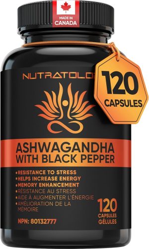 Nutratology Organic Ashwagandha | Canadian-Made | Increases Resistance To Stress & Supports Memory Enhancement – With Black Pepper For Enhanced Absorption | 650MG Ashwagandha Per Capsule – 120 Capsule