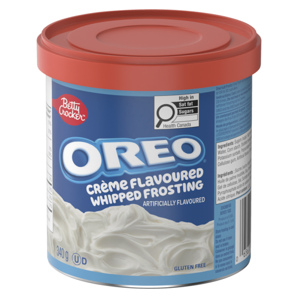 Betty Crocker brings you a whipped frosting inspired by the irresistible center of an OREO Cookie! Indulge in our Betty Crocker Gluten Free OREO Crème Whipped Frosting, designed to bring a rich, delectable taste and light, fluffy texture to your favourite desserts. This cake frosting is crafted to meet dietary needs without sacrificing flavour, making it perfect for those seeking gluten free icing options. Our OREO crème icing is not only delicious, but it also comes ready to spread, so you can enjoy the convenience of no mixing needed. Simply open the container and effortlessly spread it onto cakes, cupcakes, or cookies. With a taste reminiscent of homemade goodness, our cake icing elevates every treat it touches. Experience the authentic, from-scratch flavour that is perfect for all your icing needs and more. Make your desserts irresistible with this luscious, gluten free OREO crème frosting. Contain 340 g of frosting in total.