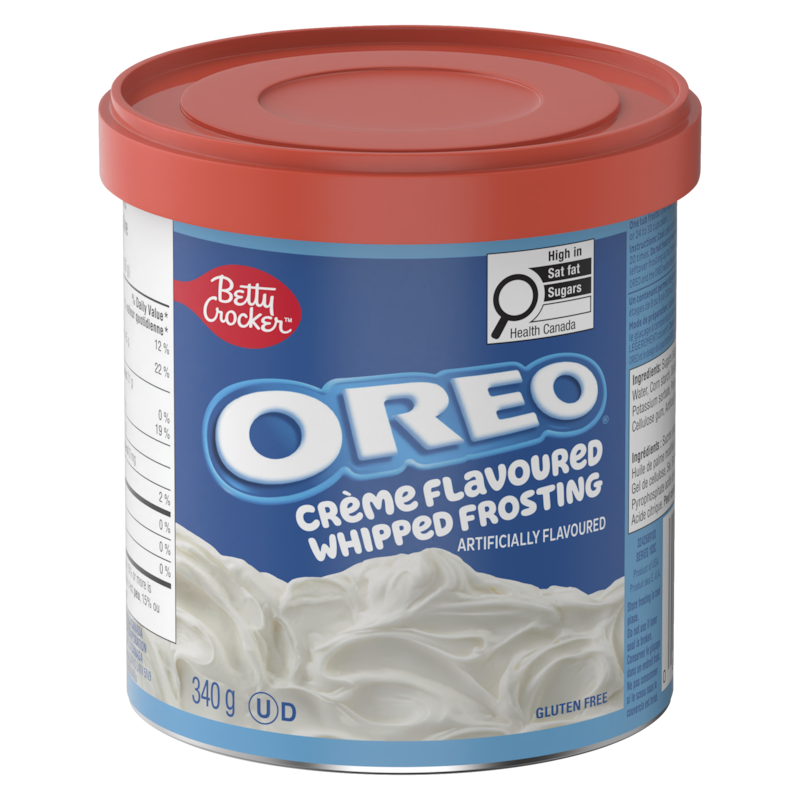 Betty Crocker brings you a whipped frosting inspired by the irresistible center of an OREO Cookie! Indulge in our Betty Crocker Gluten Free OREO Crème Whipped Frosting, designed to bring a rich, delectable taste and light, fluffy texture to your favourite desserts. This cake frosting is crafted to meet dietary needs without sacrificing flavour, making it perfect for those seeking gluten free icing options. Our OREO crème icing is not only delicious, but it also comes ready to spread, so you can enjoy the convenience of no mixing needed. Simply open the container and effortlessly spread it onto cakes, cupcakes, or cookies. With a taste reminiscent of homemade goodness, our cake icing elevates every treat it touches. Experience the authentic, from-scratch flavour that is perfect for all your icing needs and more. Make your desserts irresistible with this luscious, gluten free OREO crème frosting. Contain 340 g of frosting in total.