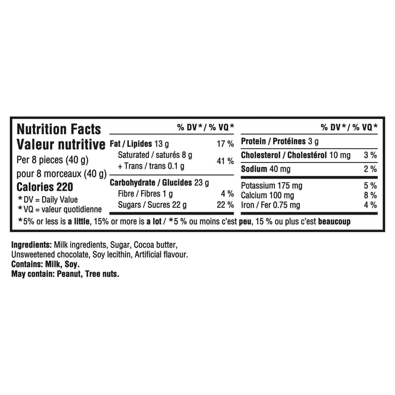 - BELOVED BRAND: CADBURY DAIRY MILK is loved by Canadians, delivering quality and joy in every bite. Savour the simple pleasure in every piece. Proudly Made in Canada with domestic and imported ingredients.