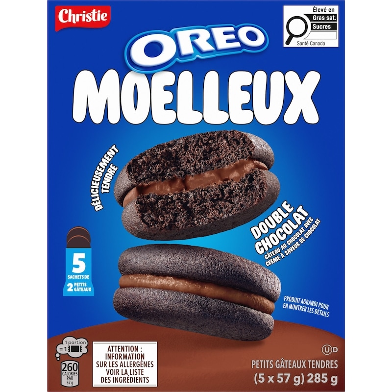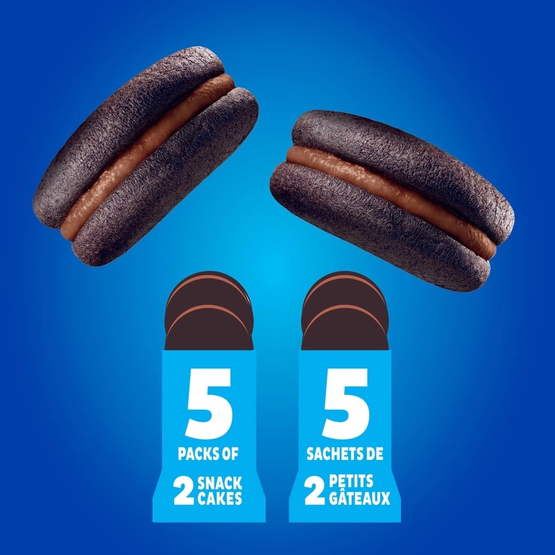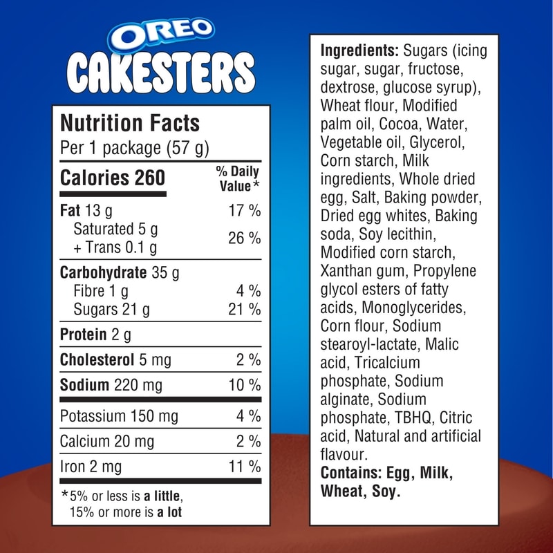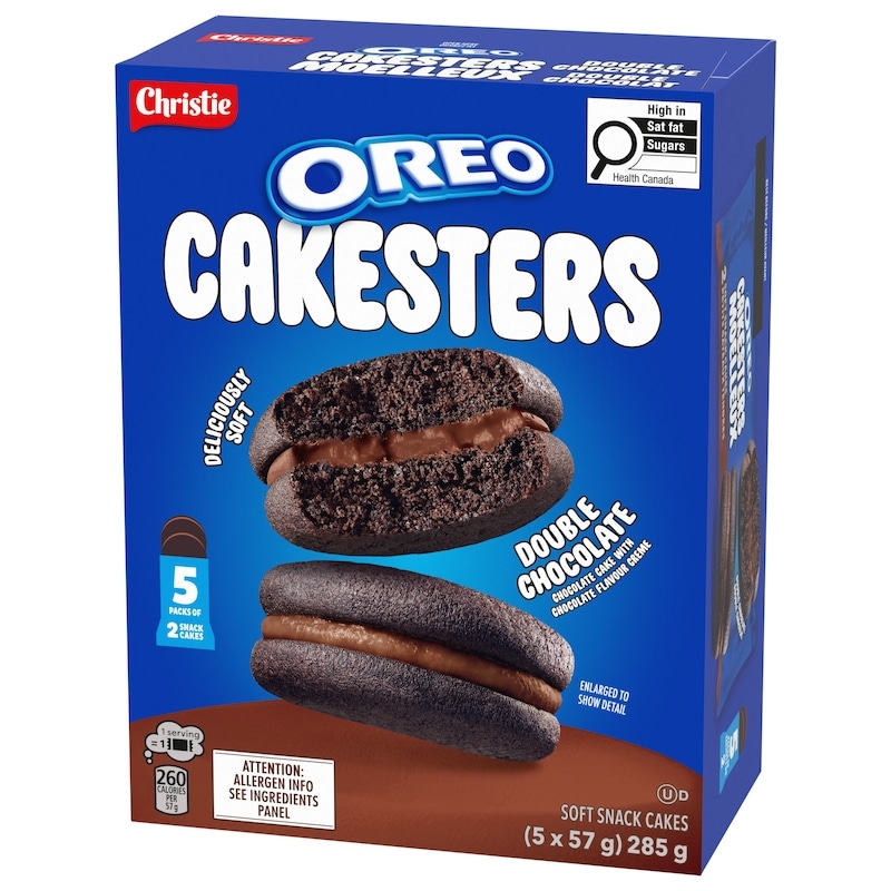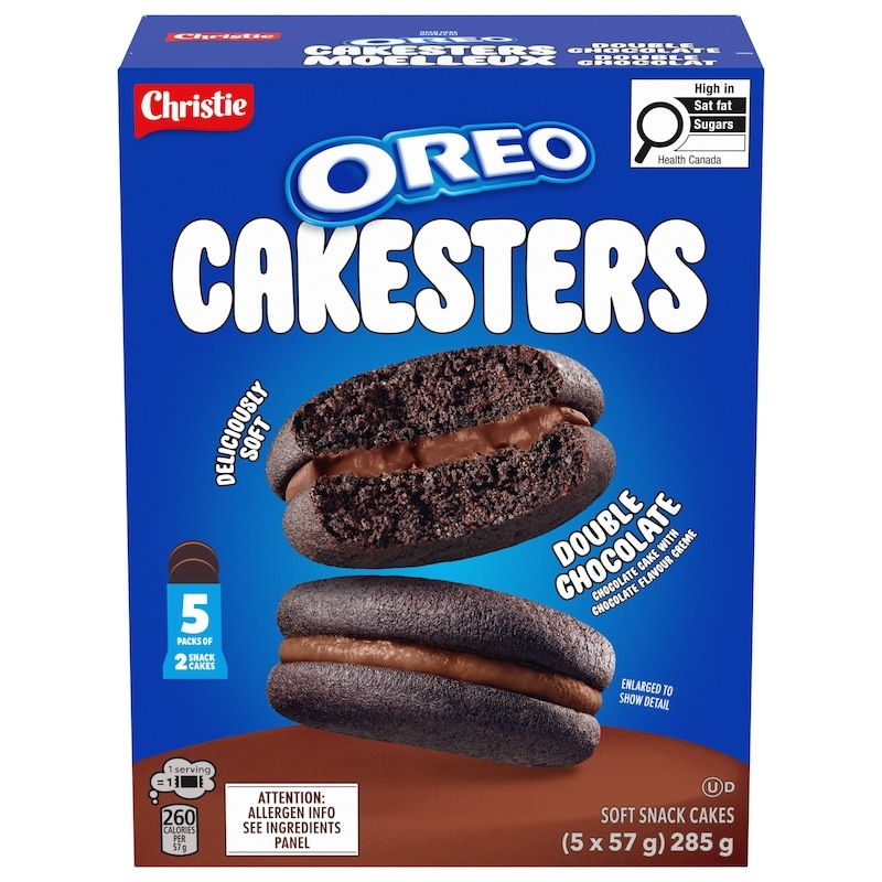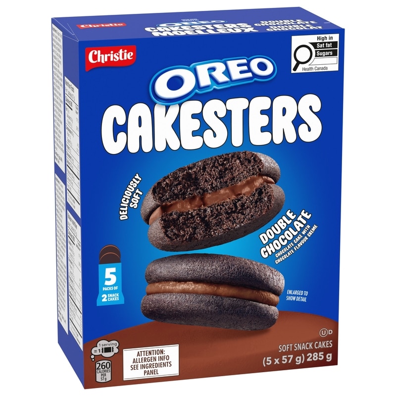 - One 285g box with five 57g snack packs of two OREO Cakesters Double Chocolate Soft Snack Cakes