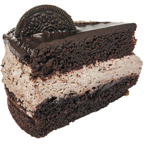 Dreams of cookies and cream. Smooth cheesecake, blended with Oreo cookie pieces, sit sandwiched between two layers of devils food cake. Finished with a dark chocolatey glaze and Oreo cookies.