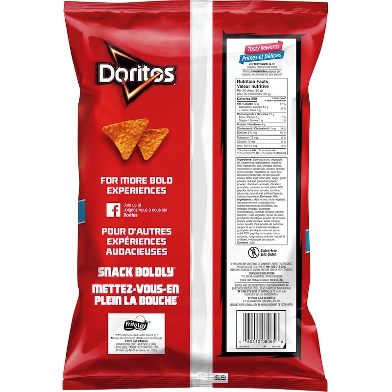 - Gluten-Free — Doritos Nacho Cheese flavoured tortilla chips are a great option for celiac-friendly diets.