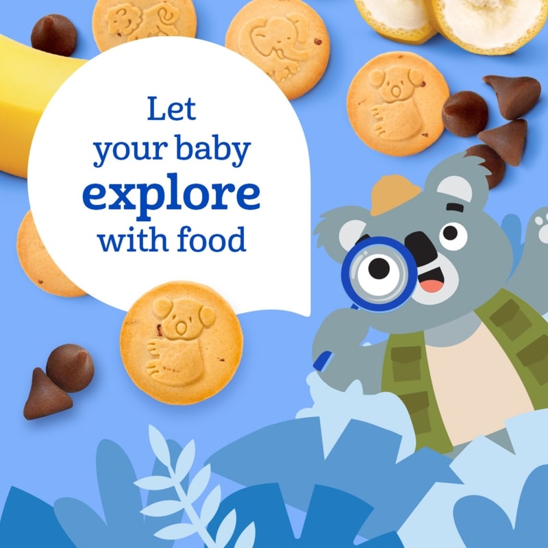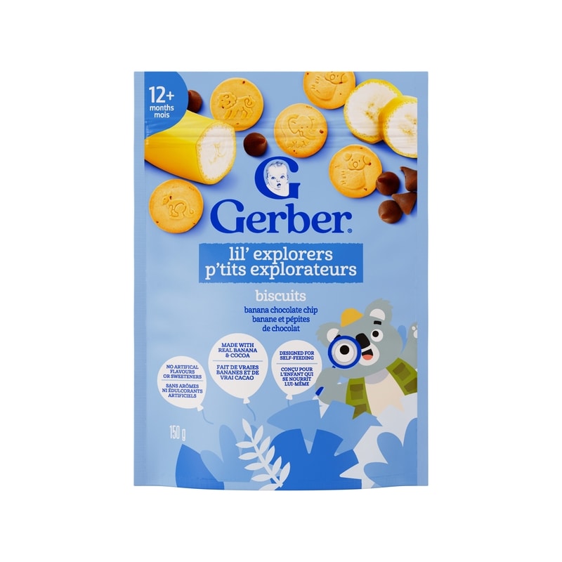 Let’s snack and play with GERBER Lil’ Explorers! Introduce your little one to a world of fun and flavour with GERBER Lil’ Explorers Banana Chocolate Chip biscuits. Specially crafted for babies and toddlers 12 months and up, these delightful snacks feature playful animal shapes designed to spark your baby’s imagination while satisfying their growing taste buds with a yummy banana chocolate flavour.Made with real banana and cocoa and absolutely no artificial colours, flavours, or sweeteners, GERBER Lil’ Explorers cookies offer a wholesome snacking option you can feel good about. Plus, their easy-to-grasp design encourages independent self-feeding — a perfect way for your little adventurer to build confidence during snack time.Whether you’re at home or on the move, these biscuits are perfect for on-the-go snacking. Just toss a pack in your bag, and you’re ready for any outing!Important: This product should only be fed to seated, supervised children who are accustomed to solid foods.Let your child snack, play, and explore — one tasty bite at a time with GERBER Lil’ Explorers Banana Chocolate Chip biscuits!