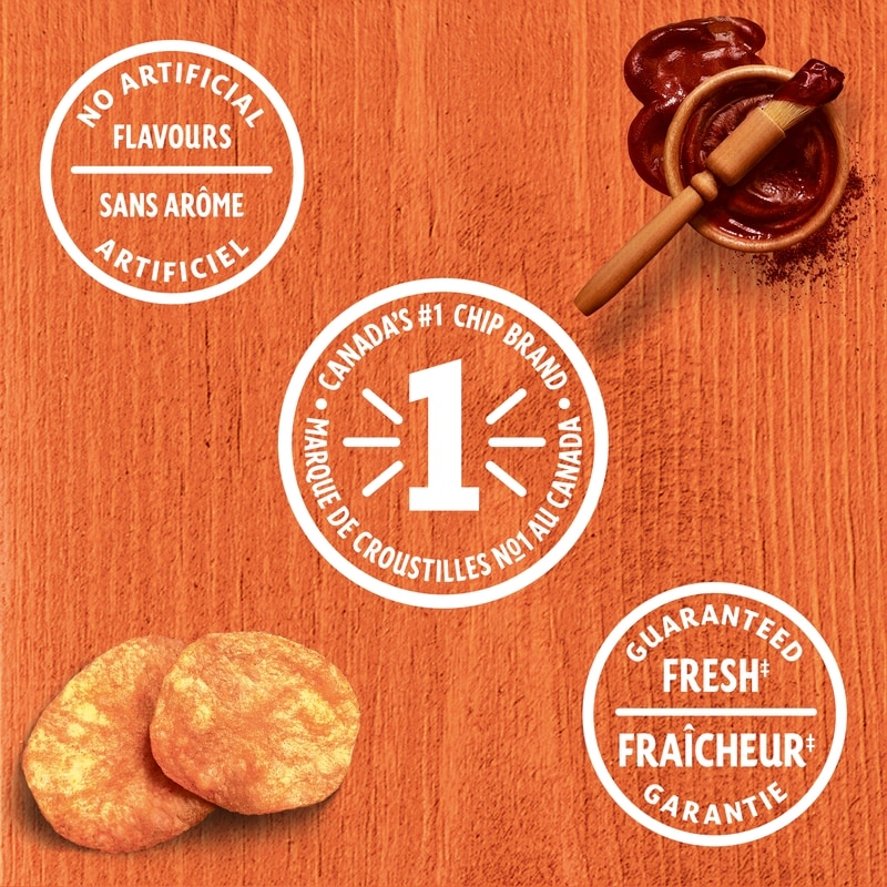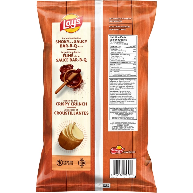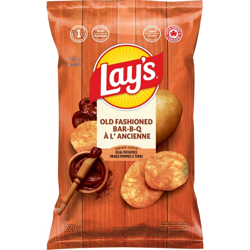 - A Canadian favourite! Lay’s Old Fashioned Bar-B-Q flavoured potato chips will excite your taste buds! The rich flavour is enhanced with a hint of smoke to create a great flavour. Lay’s Old Fashioned Bar-B-Q flavoured potato chips are an ideal snack to accompany grilled cheeseburgers at your backyard cook-out. Available in Ontario, Quebec and Atlantic Canada.Snack time just isn’t complete without the timeless taste of Lay’s potato chips! With many flavours to choose from, Canadians have been enjoying Lay’s products for many years.Lay’s potato chips are made with quality potatoes. Simple, wholesome and real. After carefully washing, peeling and slicing the potatoes, we cook them until they are perfectly crispy, creating the wonderful potato chips that Canadians know and love.Whichever flavour you choose, you can always count on our delicious potatoes, so you get that perfect, crispy chip every time you reach for Lay’s.Gluten-Free.
