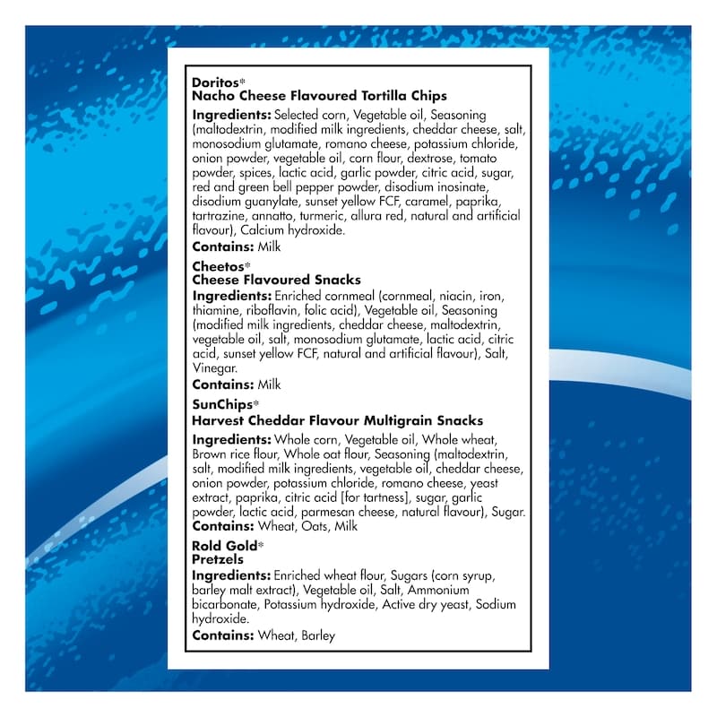 - Four Favourites — Doritos Nacho Cheese flavoured tortilla chips, Cheetos Crunchy cheese flavoured snacks, SunChips Harvest Cheddar flavour multigrain snacks, and Rold Gold pretzels, all in one bag.