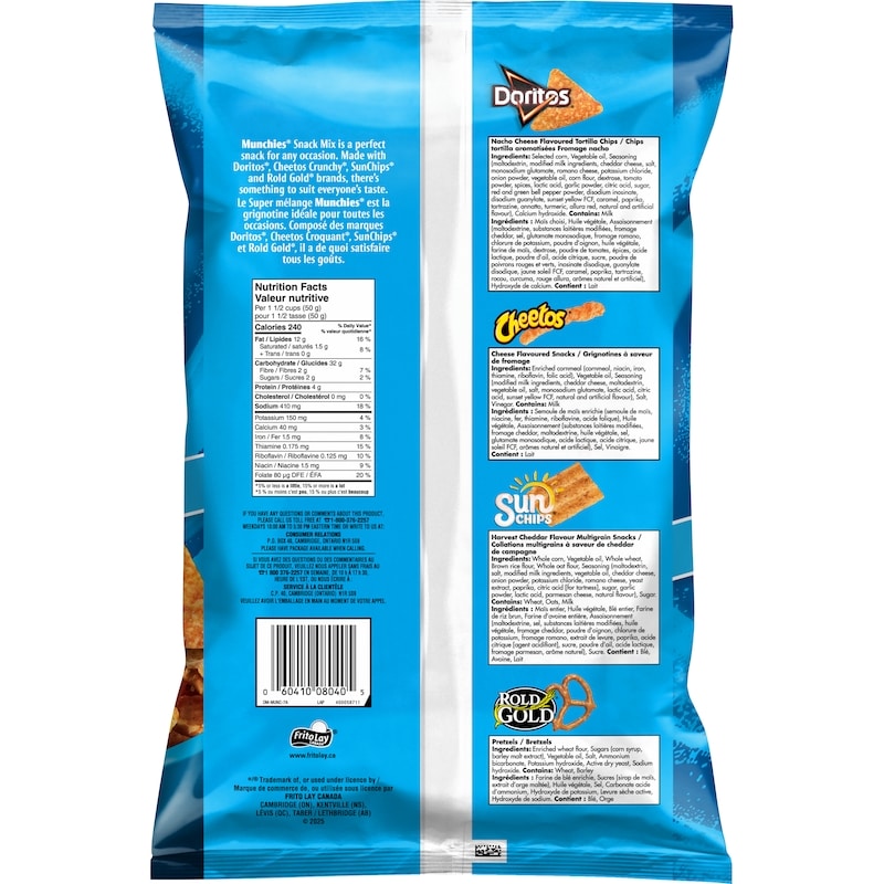 Four snacks. One bag. An endless amount of cheesy and yumminess! Munchies Original Snack Mix brings together Cheetos Crunchy cheese flavoured snacks, Doritos Nacho Cheese flavoured tortilla chips, SunChips Harvest Cheddar flavour multigrain snacks, and Rold Gold pretzels to make a savoury sensation. Grab a handful and get rewarded with a winning combination every time. Zero trans fat.