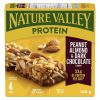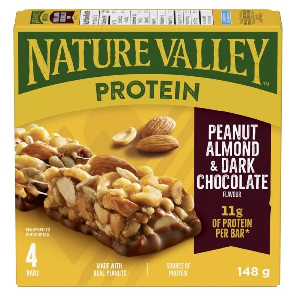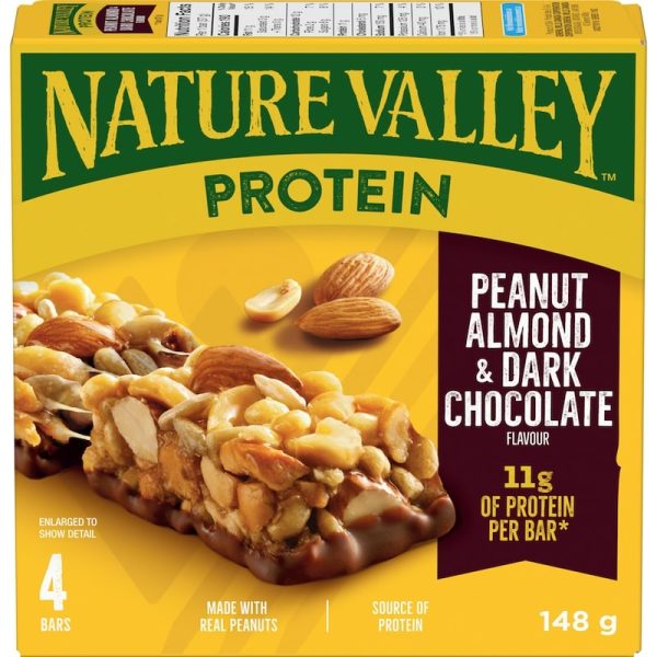 Protein that packs a punch. Nature Valley Chewy Protein Granola Bars are packed with 11 grams of protein, making them the perfect snack to keep you going. These Protein Granola Bars are made with roasted peanuts, fresh almonds and a delicious dark chocolate flavoured coating to blast through your next craving. Convenient bars for snack time or an on-the-go treat. Perfect for the pantry, snack box, and hiking trail. Made with no artificial flavours or artificial colours. At Nature Valley, we believe that what you put in is what you get out. So when you need to be great out there, you can rely on us for real energy, wherever and whenever you need it. Energy you can depend on. Contains four bars in total.