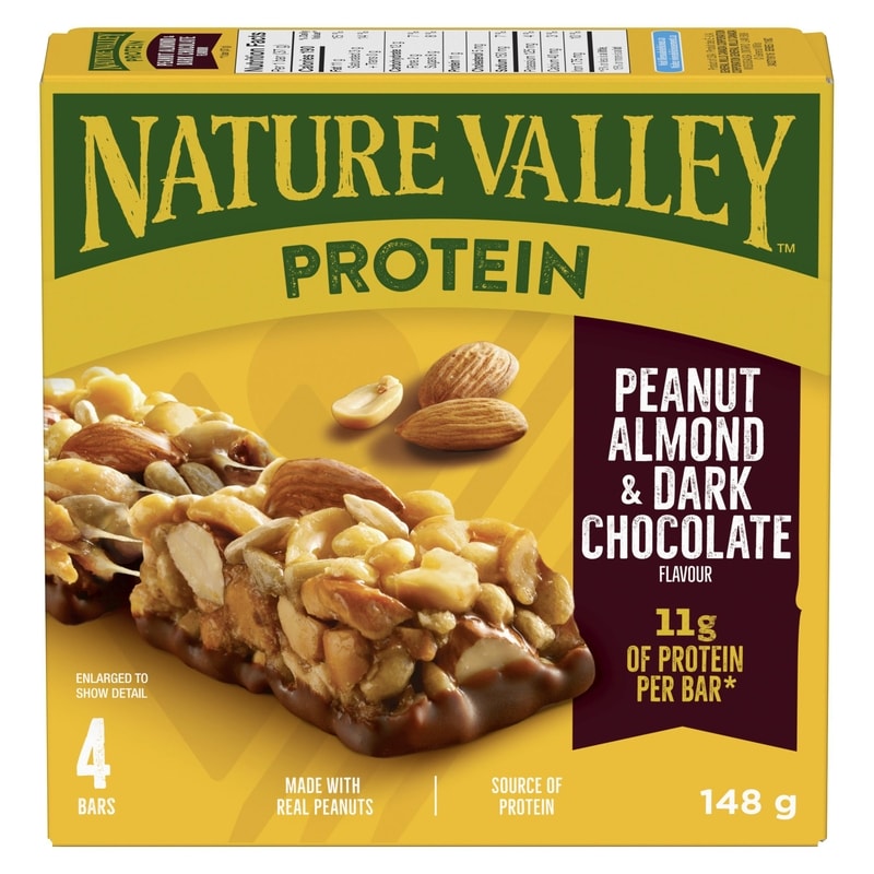 Protein that packs a punch. Nature Valley Chewy Protein Granola Bars are packed with 11 grams of protein, making them the perfect snack to keep you going. These Protein Granola Bars are made with roasted peanuts, fresh almonds and a delicious dark chocolate flavoured coating to blast through your next craving. Convenient bars for snack time or an on-the-go treat. Perfect for the pantry, snack box, and hiking trail. Made with no artificial flavours or artificial colours. At Nature Valley, we believe that what you put in is what you get out. So when you need to be great out there, you can rely on us for real energy, wherever and whenever you need it. Energy you can depend on. Contains four bars in total.