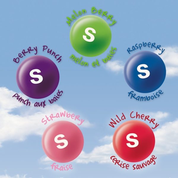 - Taste the Rainbow – Berry flavours include berry punch, strawberry, melon berry, wild cherry, and raspberry