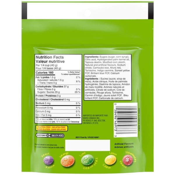 Celebrate the other side of sweet with SKITTLES Sour Chewy Candy. This bag of SKITTLES is packed with the classic sour variety flavours, including sour strawberry, sour lemon, sour orange, sour grape, and sour lime.This bite size chewy candy is deliciously sweet and sour– great while watching a movie, while playing a game or while scrolling through your favourite timeline. There’s no wrong way to enjoy the face-wrinkling, mouth-puckering taste of SKITTLES Sour Candy. Share the love with friends, family, coworkers – anyone who loves the rainbow-tasting goodness of SKITTLES Candy.