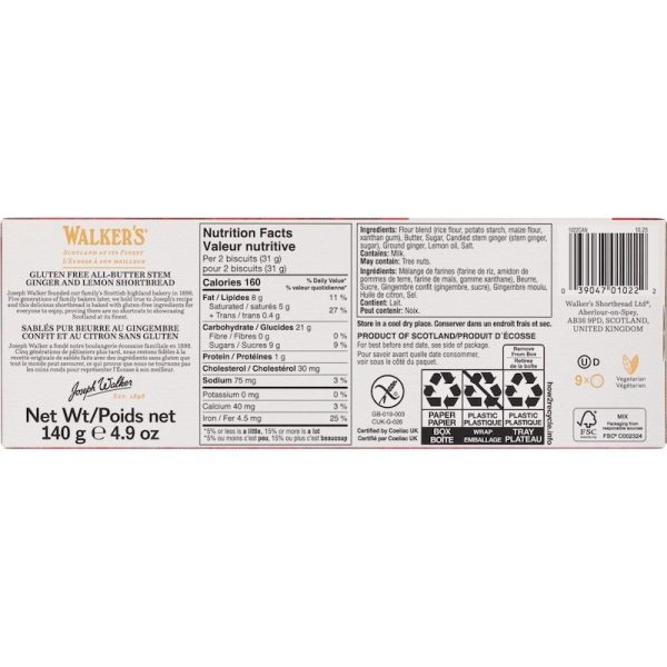 Deliciously crumbly and packed with flavour, Walker’s Gluten Free Ginger & Lemon Shortbread is the ultimate crowd-pleasing treat. With the addition of spicy ginger and tangy lemon, these shortbread cookies are perfectly paired with coffee or tea and make delicious indulgent treats all on their own. Featuring a classic all-butter bake, Walker’s shortbread cookies have the decadent flavour that will satisfy your cravings. Popular in more than 100 countries around the world, these Walker’s Shortbread are kosher, vegetarian, and gluten-free for easy sharing with friends and loved ones.