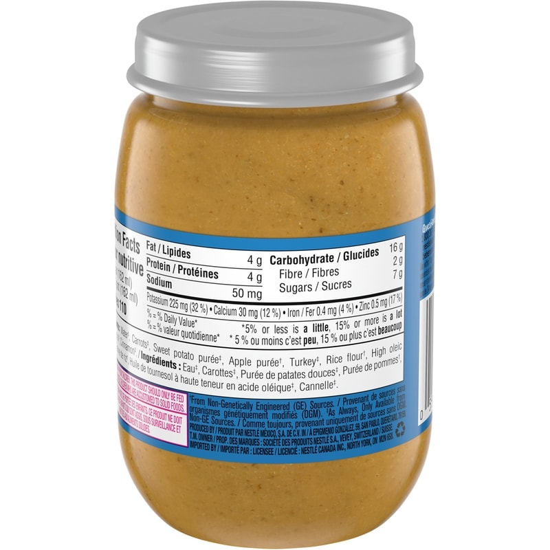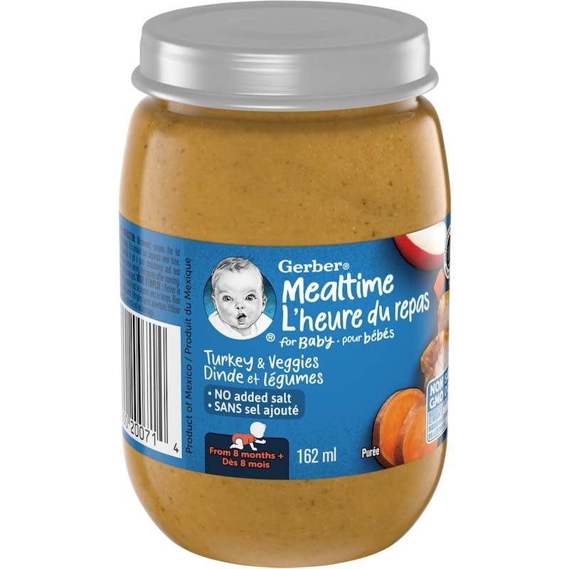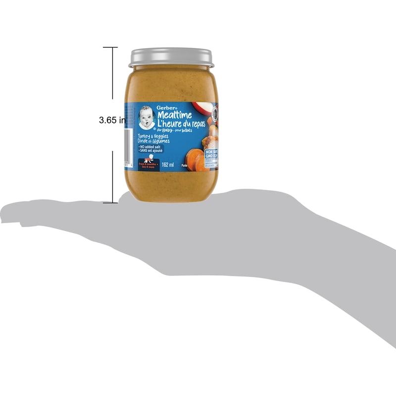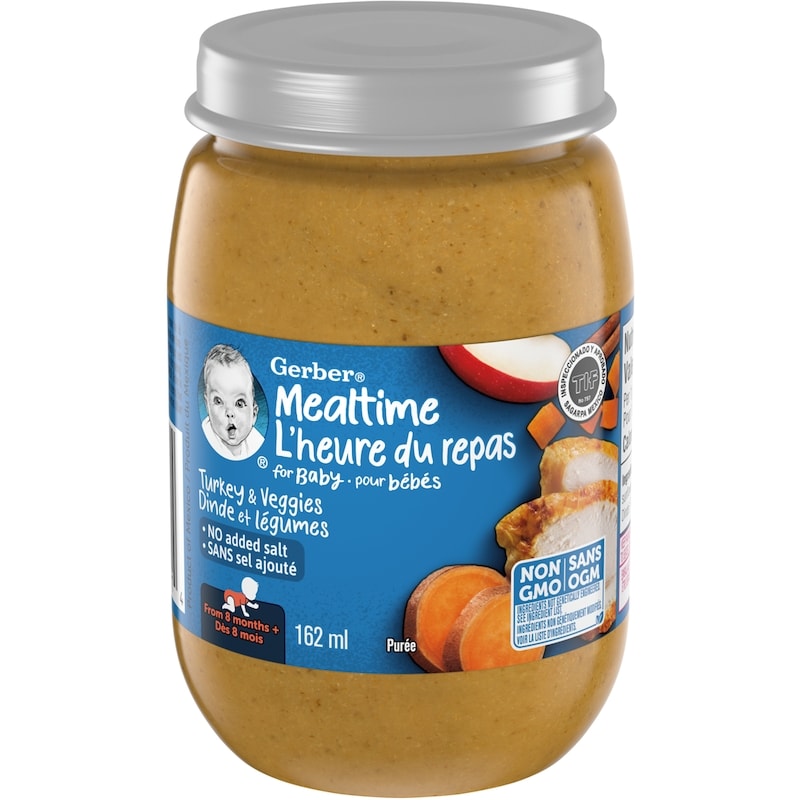 GERBER Mealtime Purée Turkey and Veggies Jar (162 ml) is a delicious meal made for your little ones who are 8 months and older. Provide your little one with an easy peasy nutritious meal, when at home or on-the-go! With a wholesome serving of delicious turkey and farm-grown veggies, each bite is a source of protein and fibre that helps introduce babies to a variety of tastes and ingredients that’s important to helping them accept new flavours. GERBER Mealtimes are portioned perfectly for little tummies, with a delicious taste that’s approved by tiny taste buds. Our recipes are lovingly made with carefully selected, 100% wholesome ingredients before being quality tested to ensure they’re good enough to be called GERBER.*Not made with genetically engineered ingredients