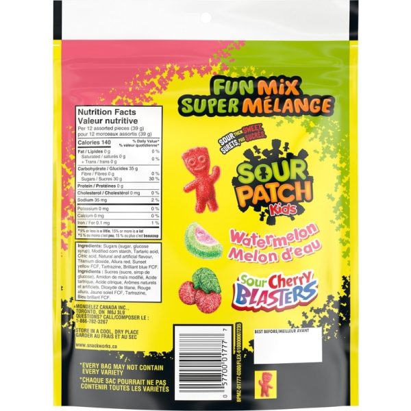 Looking for a deliciously mischievous soft and chewy gummy candy that’s sure to delight your taste buds? Look no further than SOUR PATCH KIDS Fun Mix! Each bag of SOUR PATCH KIDS Fun Mix contains an assortment of your favourite sour then sweet candies. You’ll find SOUR PATCH KIDS classic red, blue, green, yellow, and orange candies in signature assorted fruit flavours, plus SOUR PATCH KIDS Watermelon and SOUR PATCH KIDS Cherry Blasters in every bag!