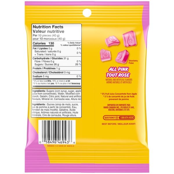 Introducing NEW STARBURST All Pink Gummy Candy, a gummy experience like no other that also satisfies your sweet craving. New STARBURST All Pink Gummy Candy delivers a unique, soft, squishy and airy texture with the same juicy STARBURST flavours you love. These playful and fluffy gummies are soft to bite into, easy to chew, and best of all – won’t stick to your teeth! Soft, chewy, and oh so fun, these tasty, aerated gummies come in the all pink flavour to help you escape the everydayness of your day. This pack is perfect for an afternoon treat at your desk, or to help you unwind at night. Unleash your imagination in an unimaginative world with a new candy that represents a new era in gummy candy. Keep a pack in your pantry or at your desk for a sour candy treat anytime.