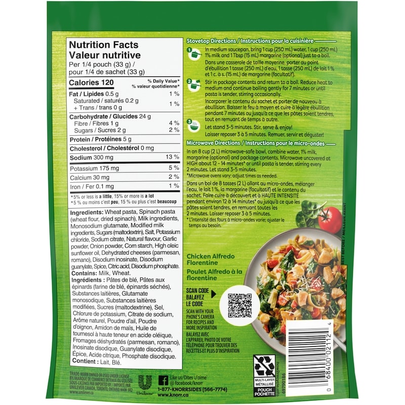 - Knorr Sidekicks Fettuccine Alfredo Pasta Side Dish expertly combines golden and spinach rippled pasta in a Parmesan cream sauce