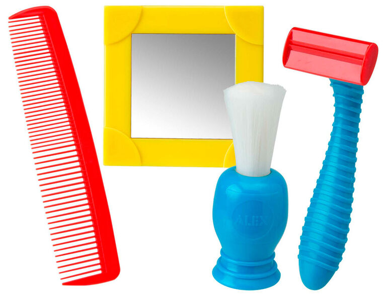 ALEX Rub a Dub Shaving in the Tub lets you lather up for a nice, clean – and safe – shaving experience in the tub. Use the brush to put shaving cream on your face or legs, then scrape it off with a pretend razor. The shaving cream is actually soap, so your little one is washing while they groom.