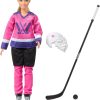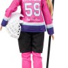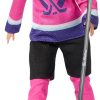 - The Barbie doll is dressed to hit the ice with her pink, purple, and teal hockey jersey, hockey pants, and helmet.