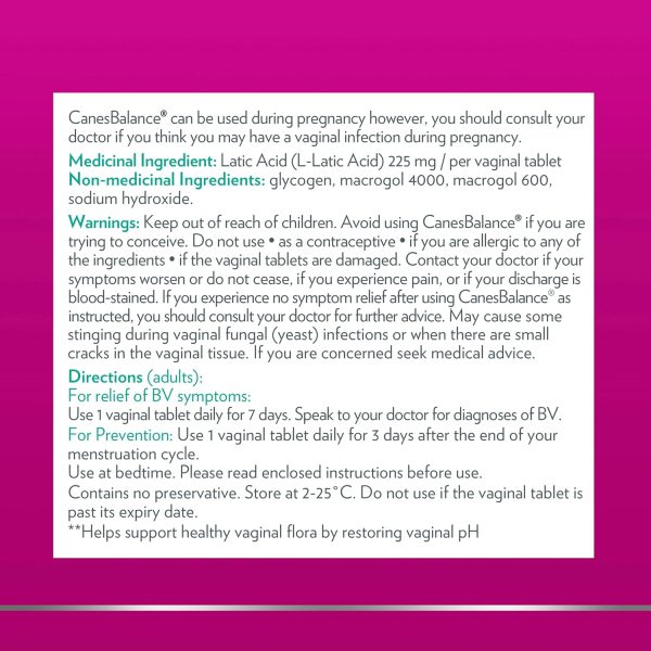 - Clinically Shown Effective Relief – CanesBalance soft vaginal tablets is a 7-day treatment with a formula clinically shown to help treat the symptoms of Bacterial Vaginosis such as unpleasant odour and abnormal vaginal discharge. It can be used alone or alongside the antibiotic metronidazole to treat BV.