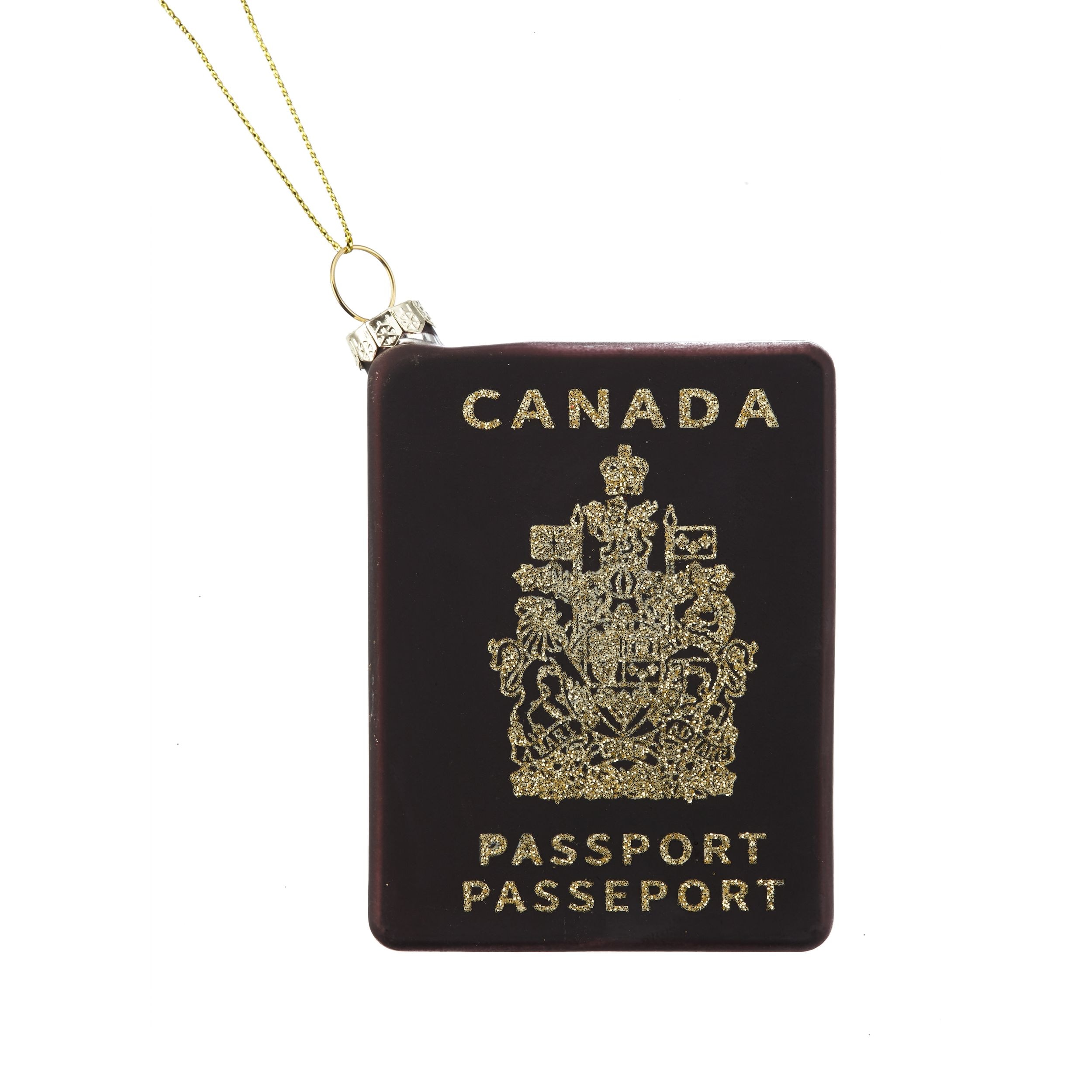 Show your holiday guests that you’re going places with the CANVAS Red Collection Canadian Passport Ornament. This travel ornament looks like the real thing, but has a glimmer that adds sparkle to any holiday display. The passport ornament is crafted from blown glass to create a quality look and feel that fits right in on your Christmas tree. This unique ornament is a thoughtful gift idea for travellers. It measures 90 mm and comes ready to hang.