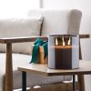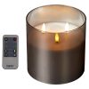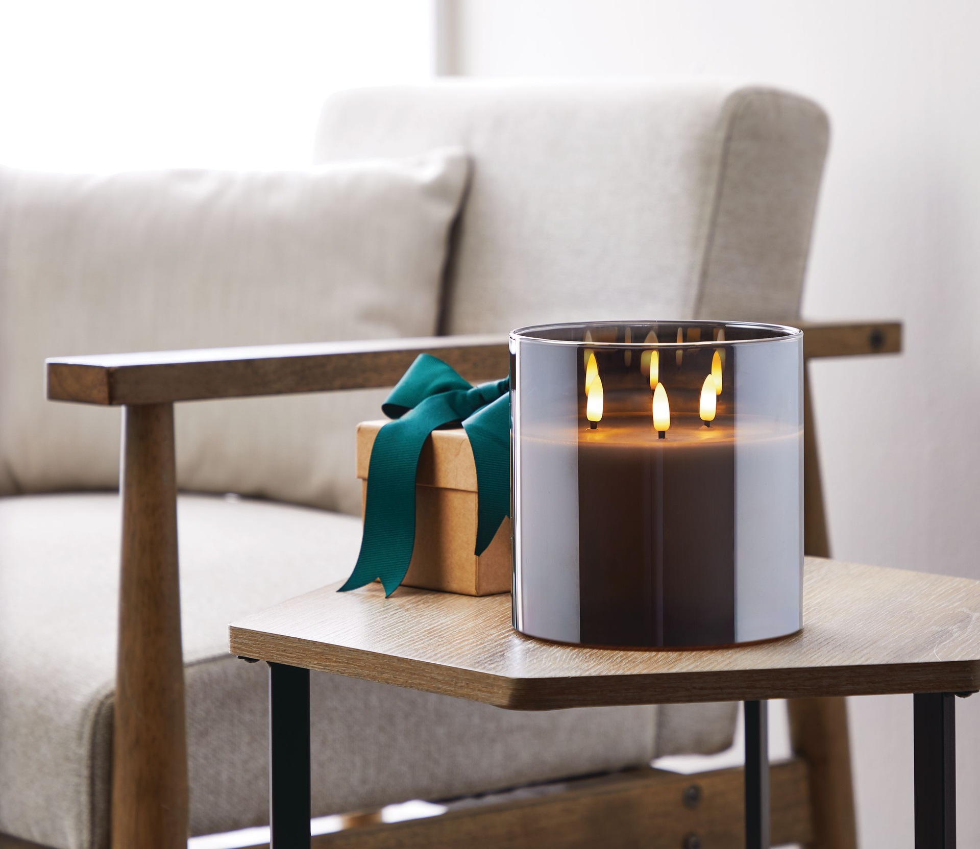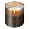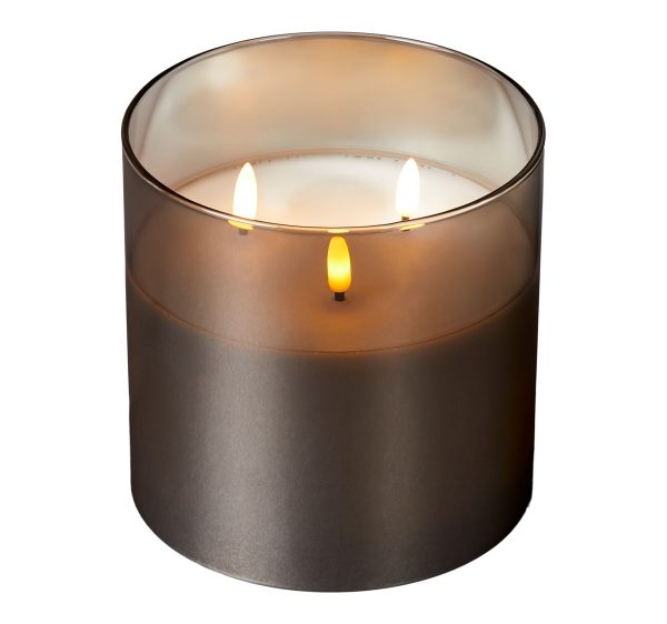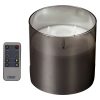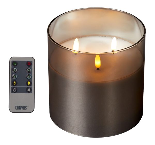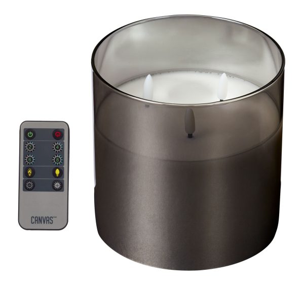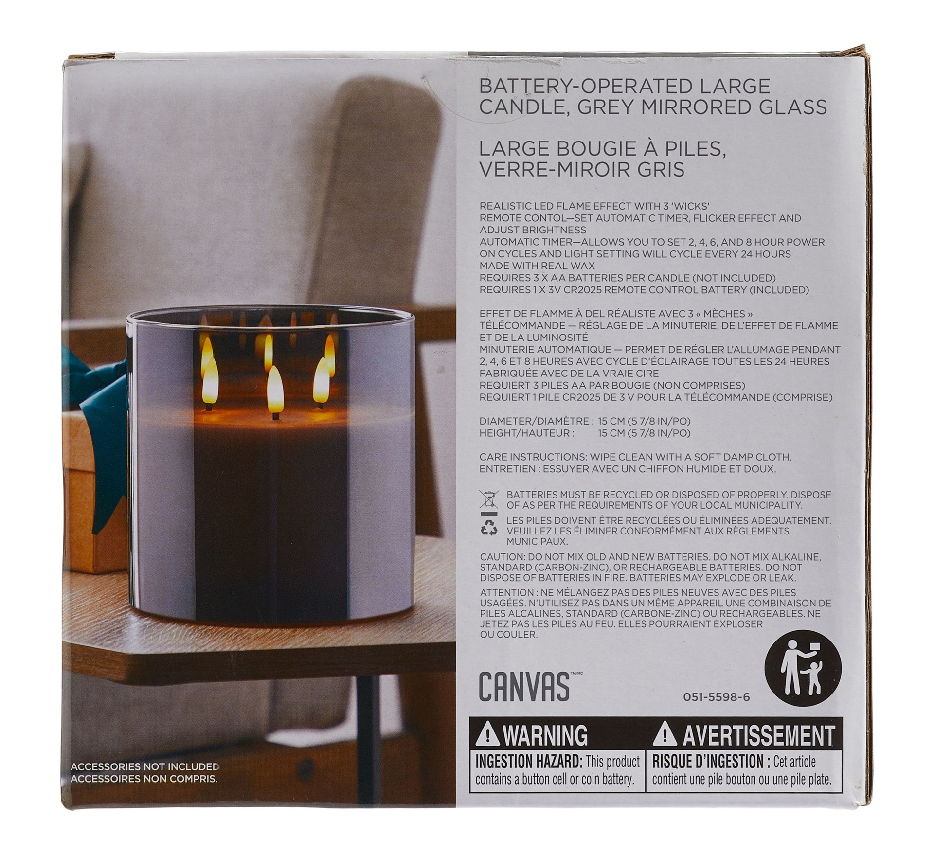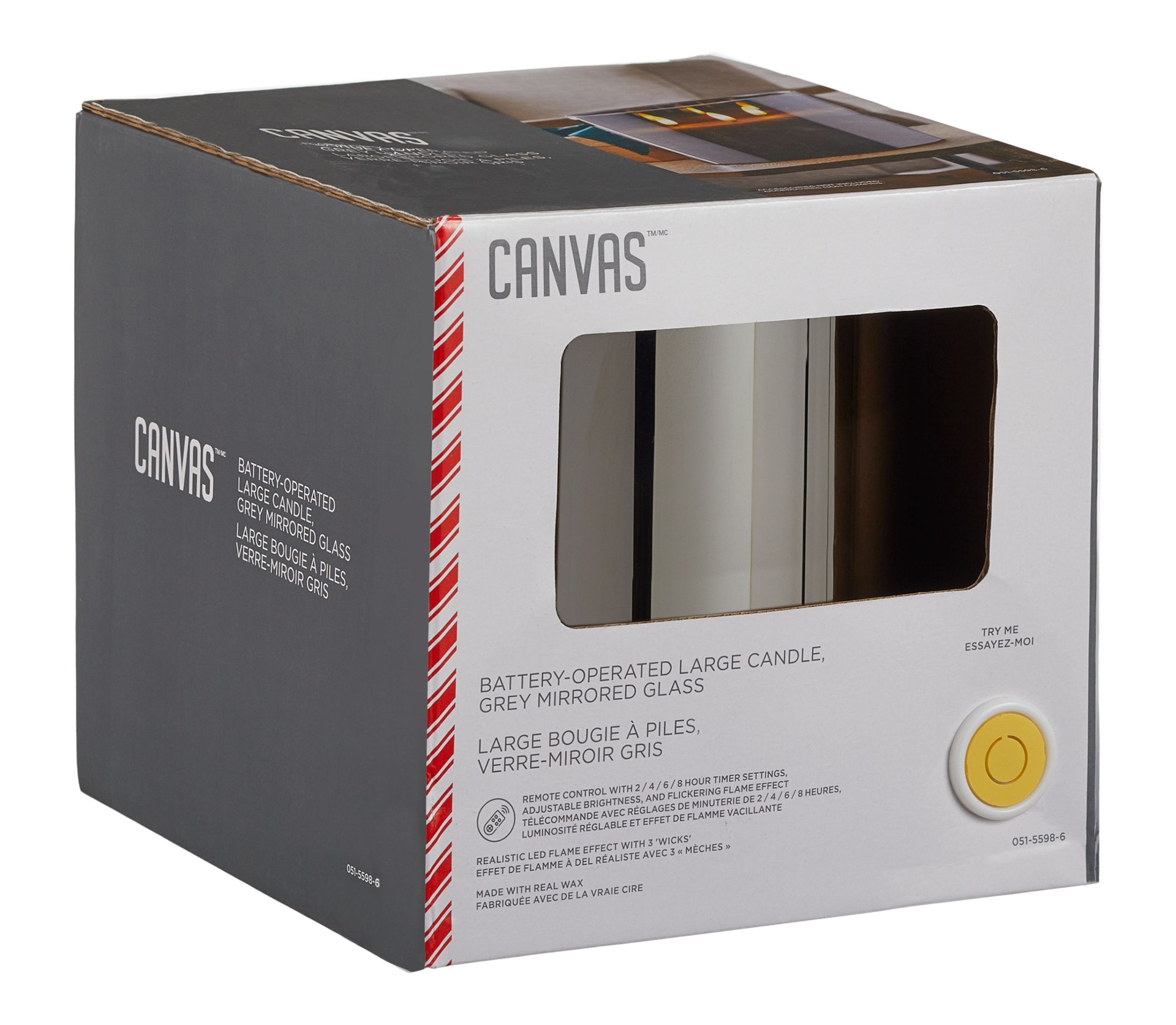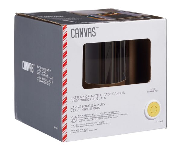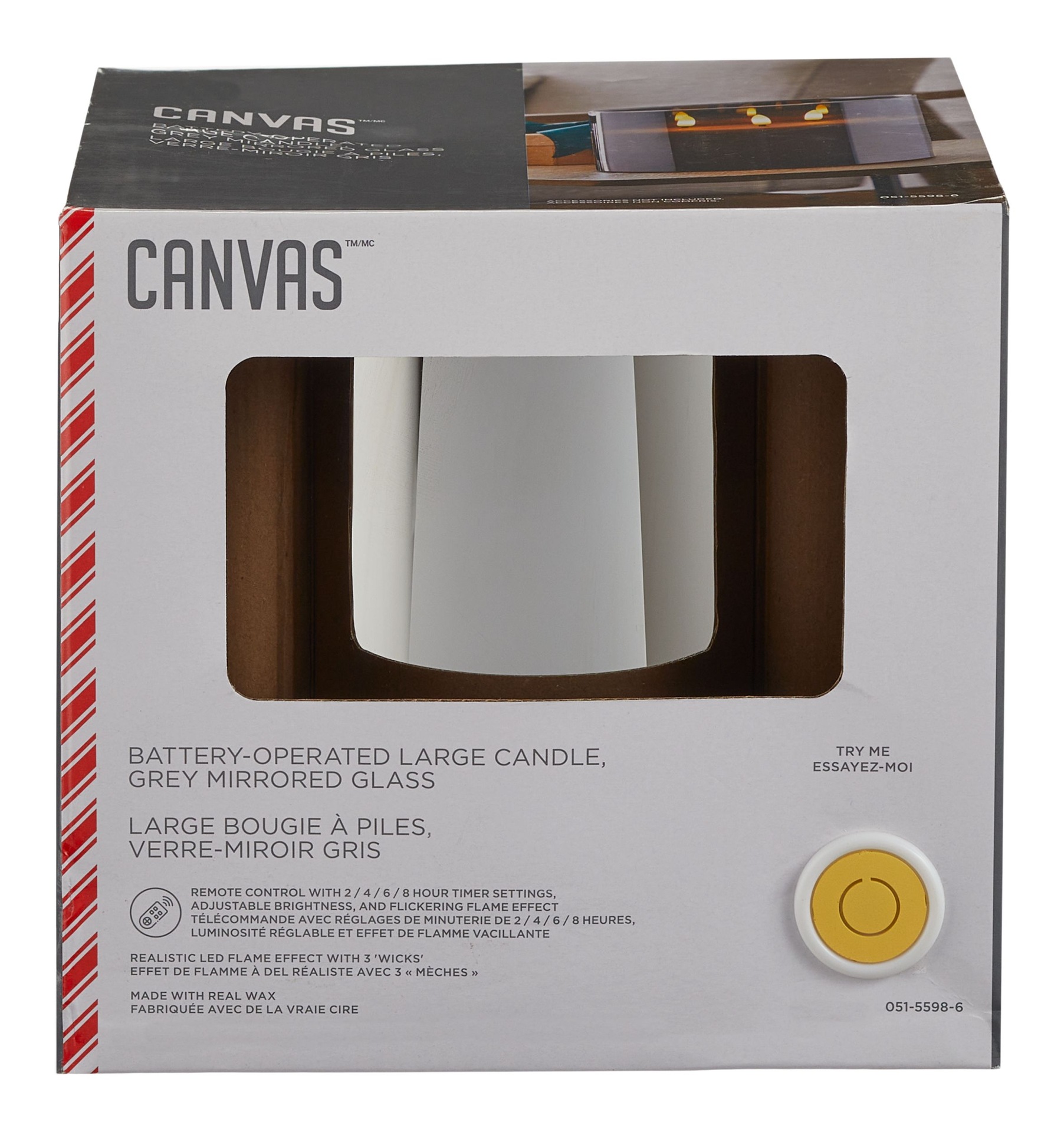 The CANVAS Tabletop Christmas Battery-Operated LED Candle with Remote & Timer adds a realistic flame effect to your holiday decor. Made of real wax and glass, this gray mirrored candle requires 3 AA batteries and provides a flickering candle effect.