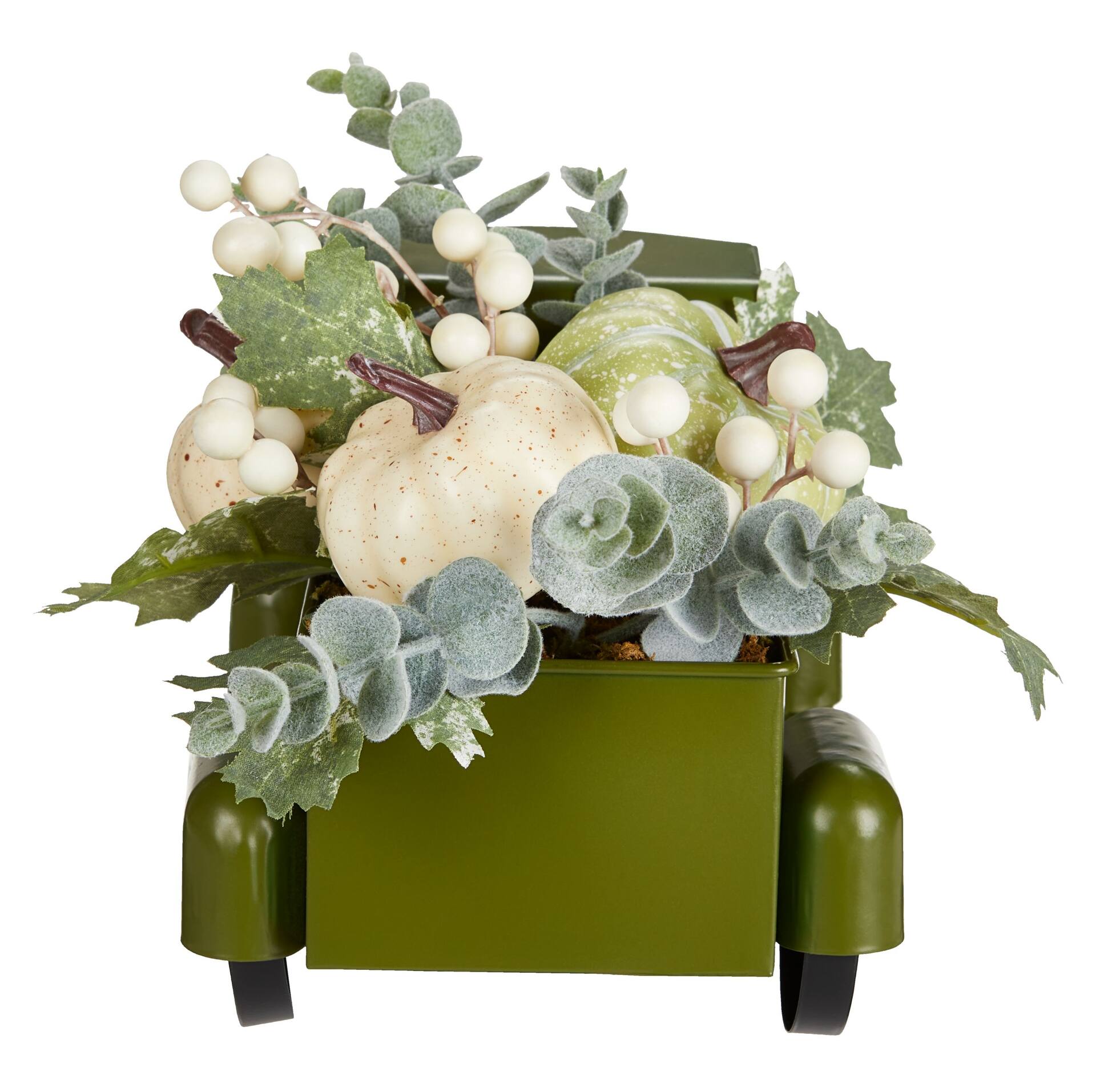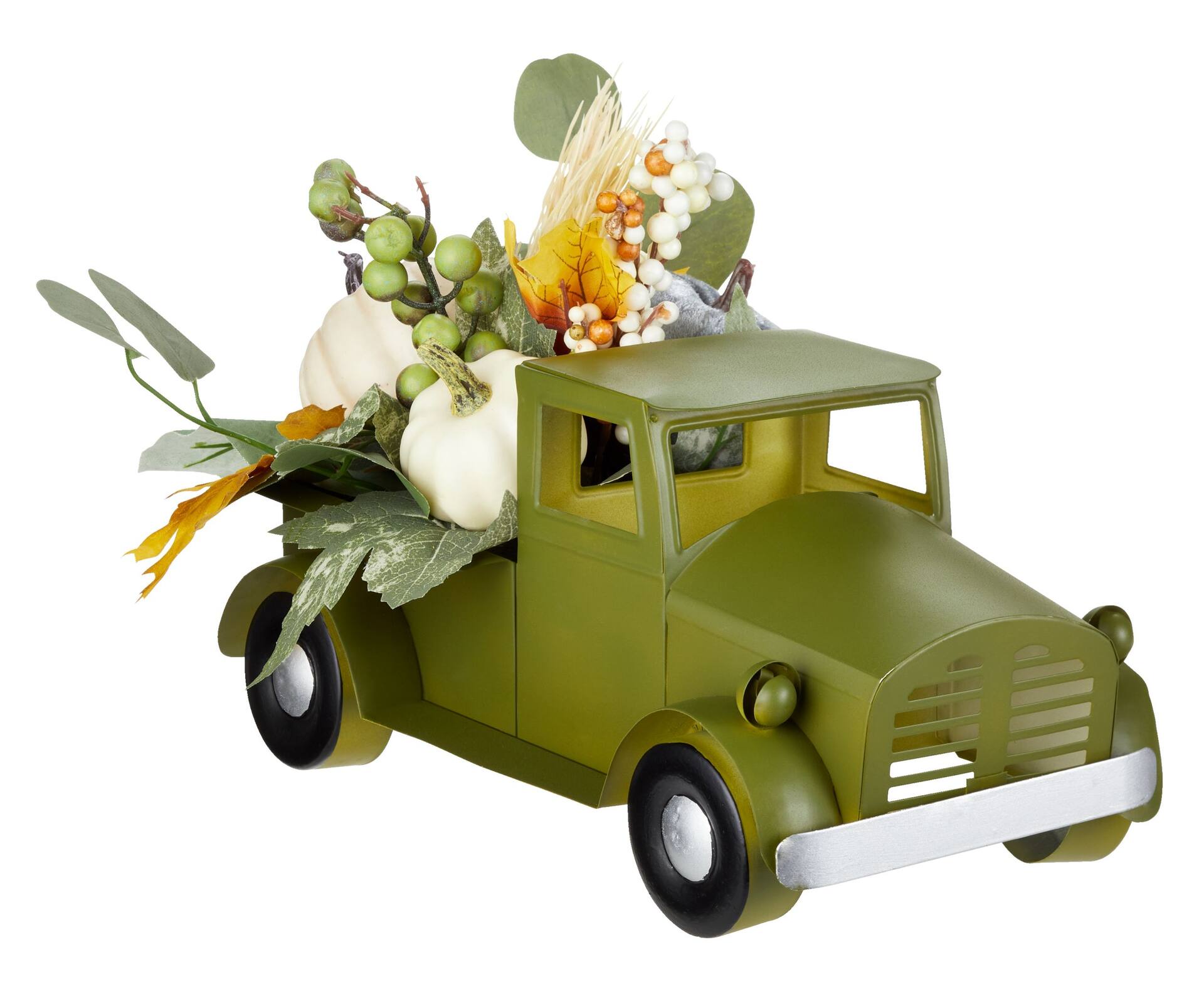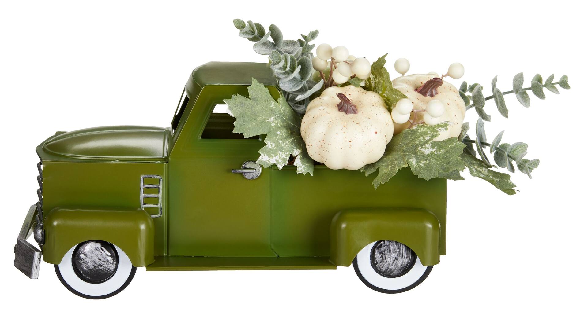 The CANVAS Floral & Pumpkins Truck, Tabletop Fall & Thanksgiving Home Decorations, Green, 8-in, is the perfect fall decoration this season. This small living room fall decor merges well with your other icons and evokes a welcoming feel. Ideal for indoor space, you can place it on the dining table, console table, mantle, and more. The fall truck decor features beautiful artificial flowers and small white pumpkins to add a festive touch to your fall decor. Creating a nice, beautiful look, the pumpkin truck decor measures 8 inches (20.3 cm) in length.