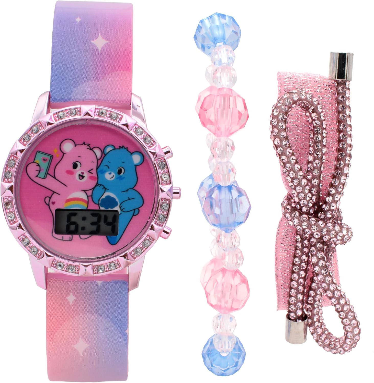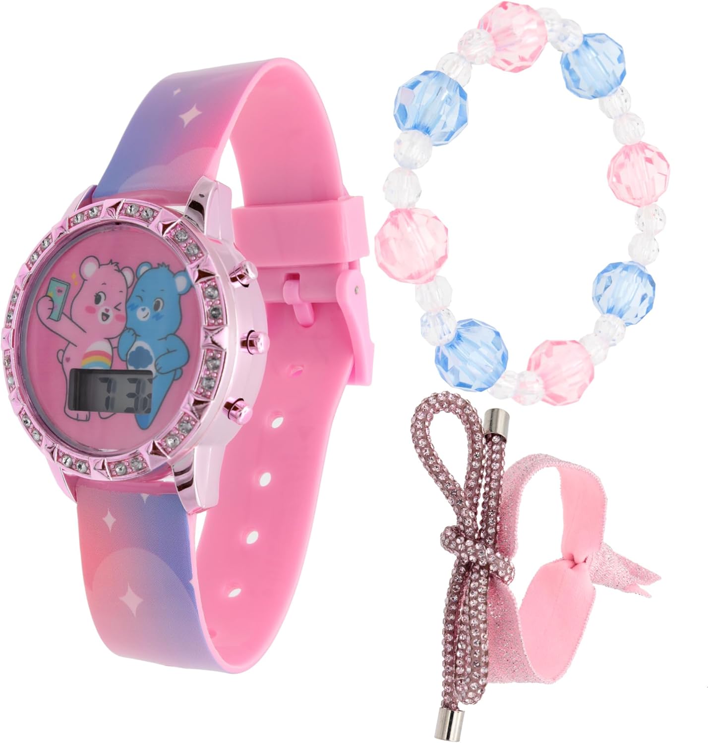 Care Bears Watch Gift Set for Girls with Digital Time Display and Sparkly Rhinestone Bezel Includes Matching Stretch Bracelets and Hair Accessories – Pink (CRB40002AC)