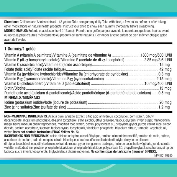- For children ages 4-13 years old: give one gummy multivitamin daily with food