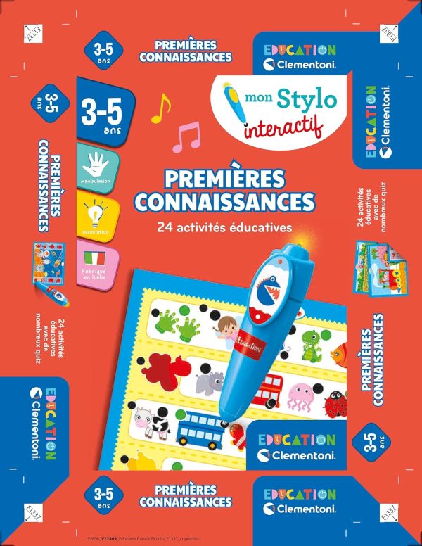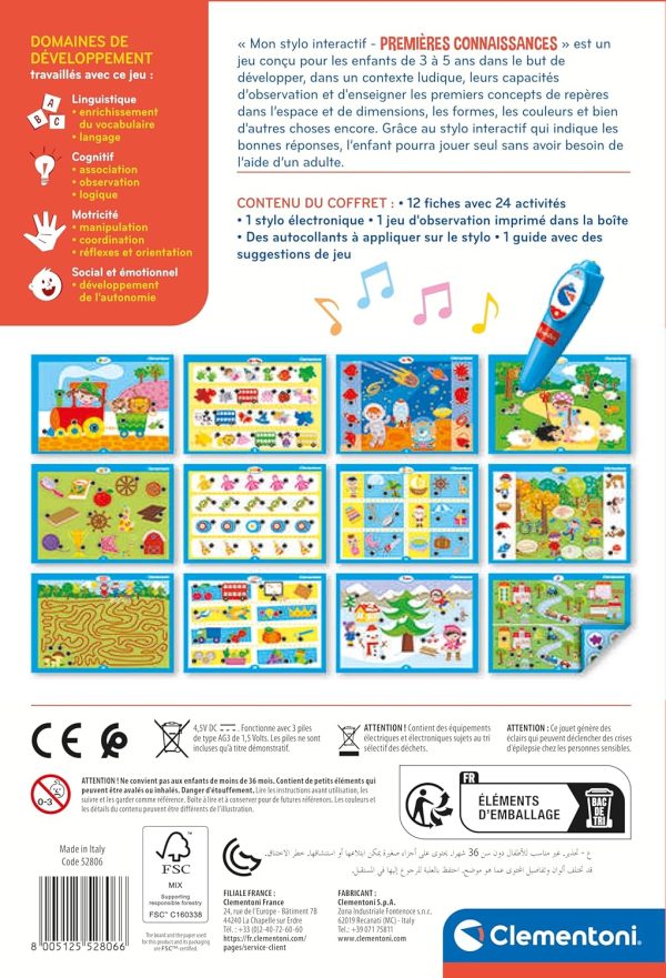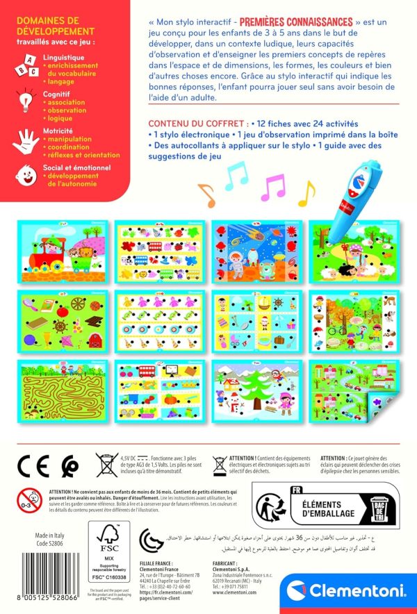Contenu:: 12 fiches avec 24 activités, 1 stylo électronique, 1 jeu d’observation imprimé dans la boîte, des autocollants à appliquer sur le stylo, 1 guide avec des suggestions de jeu.