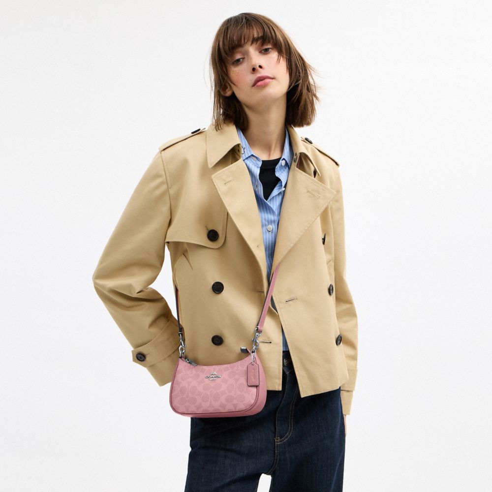 The Teri Mini Crossbody is the smallest bag in our beloved Teri Collection. Crafted of Signature coated canvas, this mini crossbody bag is designed for everyday wear. It has a detachable long strap so you can switch up how you wear it—from shoulder bag to crossbody. This canvas mini crossbody bag is perfect for carrying daily essentials like your keys and cards—plus, the inside snap pocket helps to separate and secure your items.