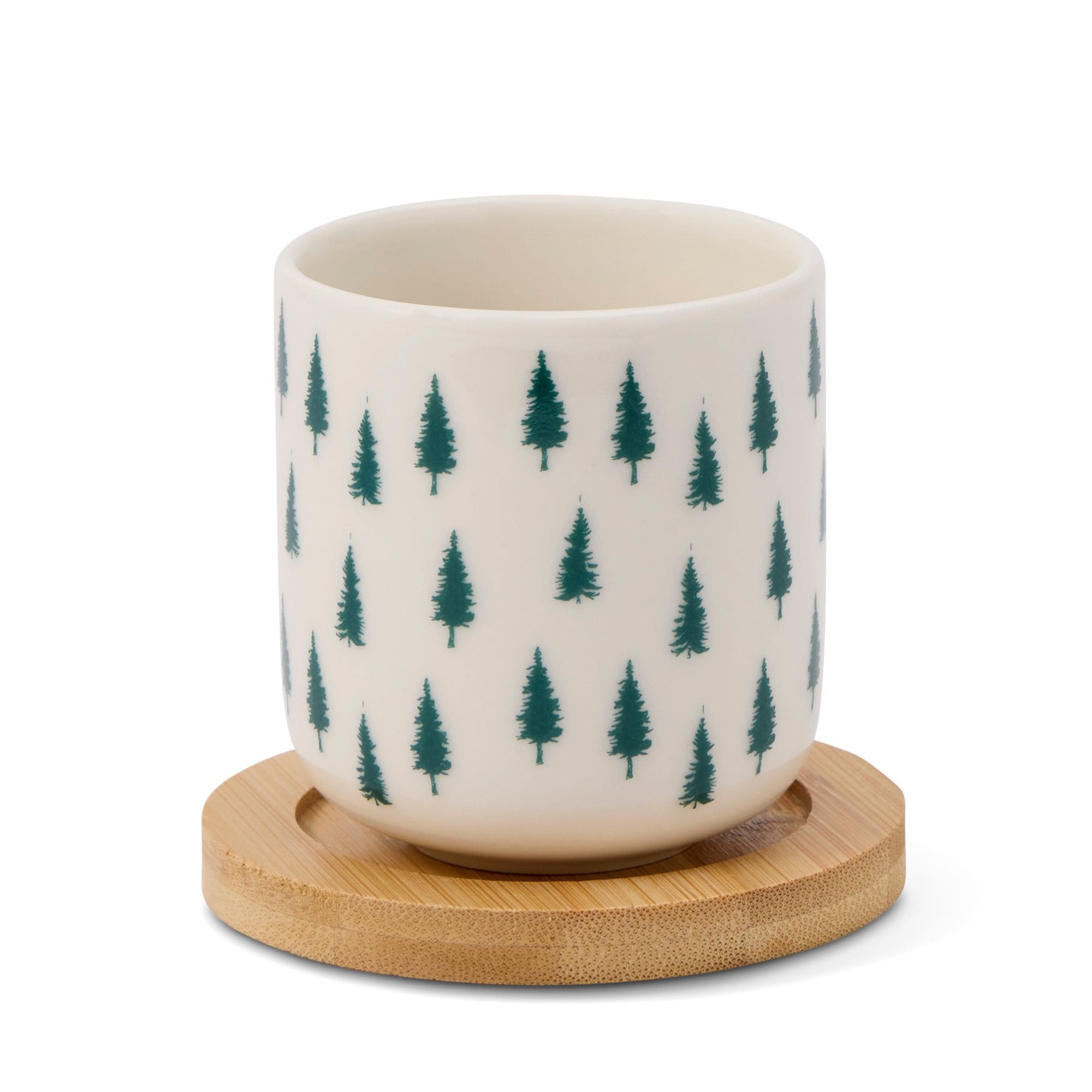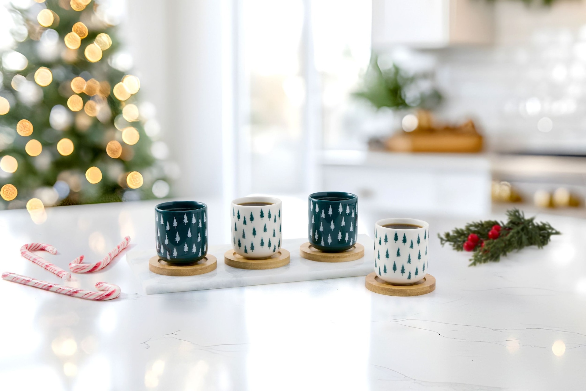 This festive Espresso set includes four stoneware cups, perfect for serving espresso in style. The addition of bamboo coasters adds a touch of natural sophistication to your coffee routine.