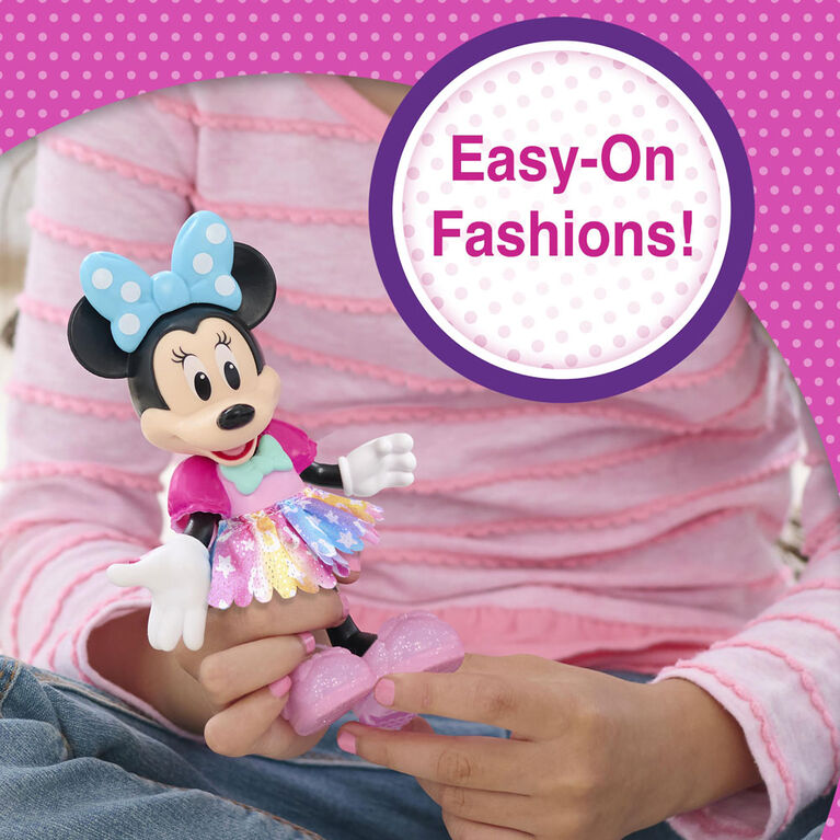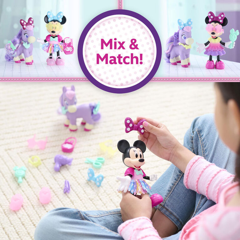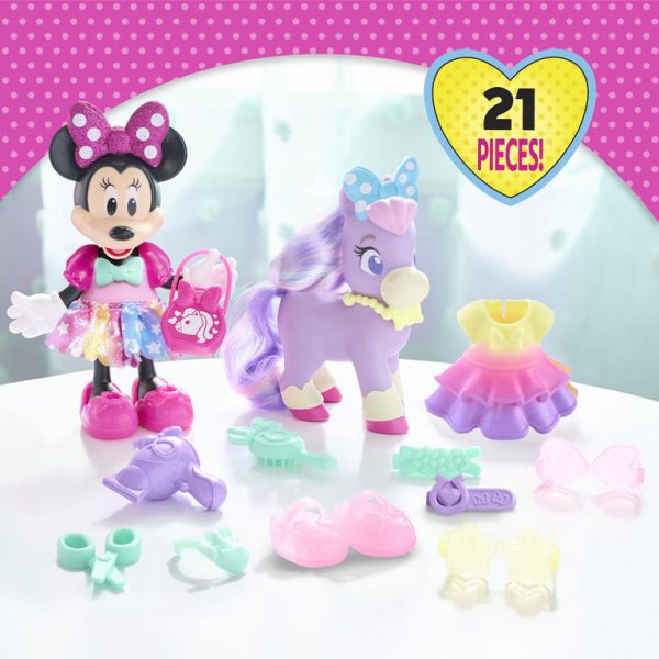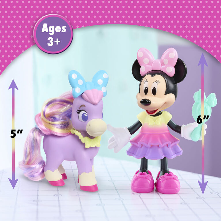 Celebrate the bonds shared between favorite animal besties with the Disney Junior Minnie Mouse Groom & Glam Pony Set. Kids will have a great time helping Minnie Mouse get her pony looking her best. This small doll and accessory set comes with 21 fun pieces. In addition to the 6-inch-tall articulated Minnie Mouse doll and 5-inch-tall pony, find 2 dresses, 2 pairs of shoes, a handbag, 2 hair barrettes, play scissors, a play hairdryer, and a hairbrush. Mix-and-match 3 bows, 2 necklaces, and 2 pairs of sunglasses between Minnie Mouse and the pony. Use the brush to groom the pony’s rooted, multicolored mane and tail. Create new styles using the 2 hair barrettes. Coordinate outfits for fun horse fashion shows and other imaginative outings. All of Minnie Mouse’s dresses and accessories are soft-molded and super simple for little hands to change. This fantastic mix-and-match preschool toy makes a wonderful birthday or anytime surprise for kids ages 3 years and up.