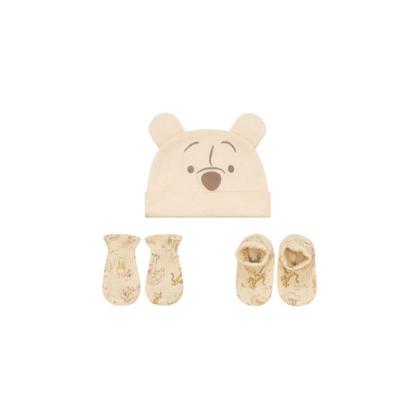 Winnie The Pooh 3 piece accessory set, features hat, mitts and socks. Newborn hat helps keep baby warm at all times. Hat has a folded cuff and 3D ears on top. Simple and fashionable style make baby hat pair with any newborn outfit. Super soft baby mittens will prevent baby from accidently scratching themselves. Mittens have soft elastic around the wrist which widens for an easy on-off wear. Soft socks to keep baby warm and cozy. The socks are cute and can be paired with any outfit. Soft, warm and breathable, perfect for everyday wear.