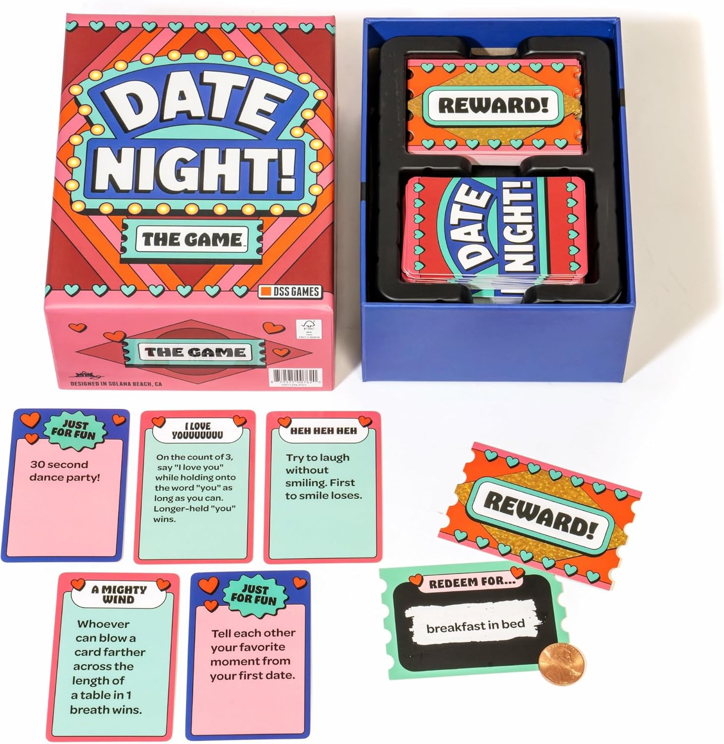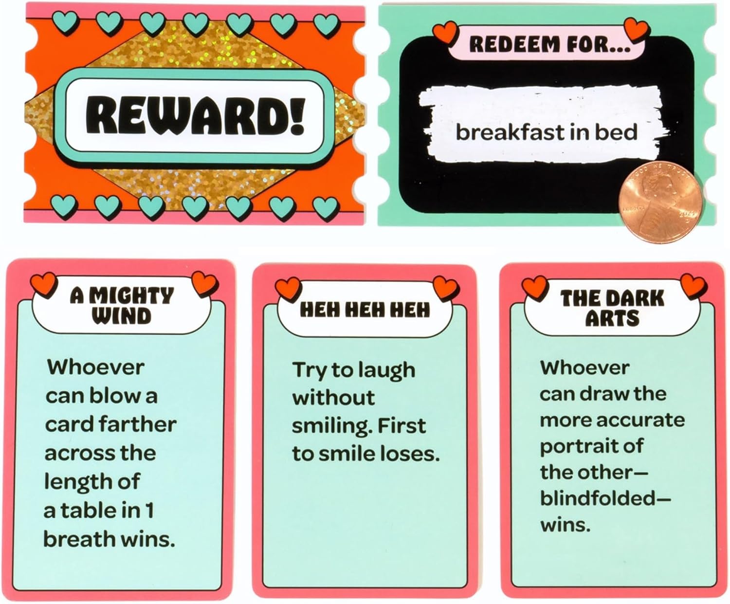 - How to play: Compete in fun, fast-paced challenges against your partner, from silly dares to creative tasks. Win a challenge, keep the card. The first player to collect 5 winning cards earns a scratch-off reward ticket revealing a surprise prize! Along the way, you’ll also draw “Just for Fun” cards, which offer sweet breaks from competition that spark laughter and connection.