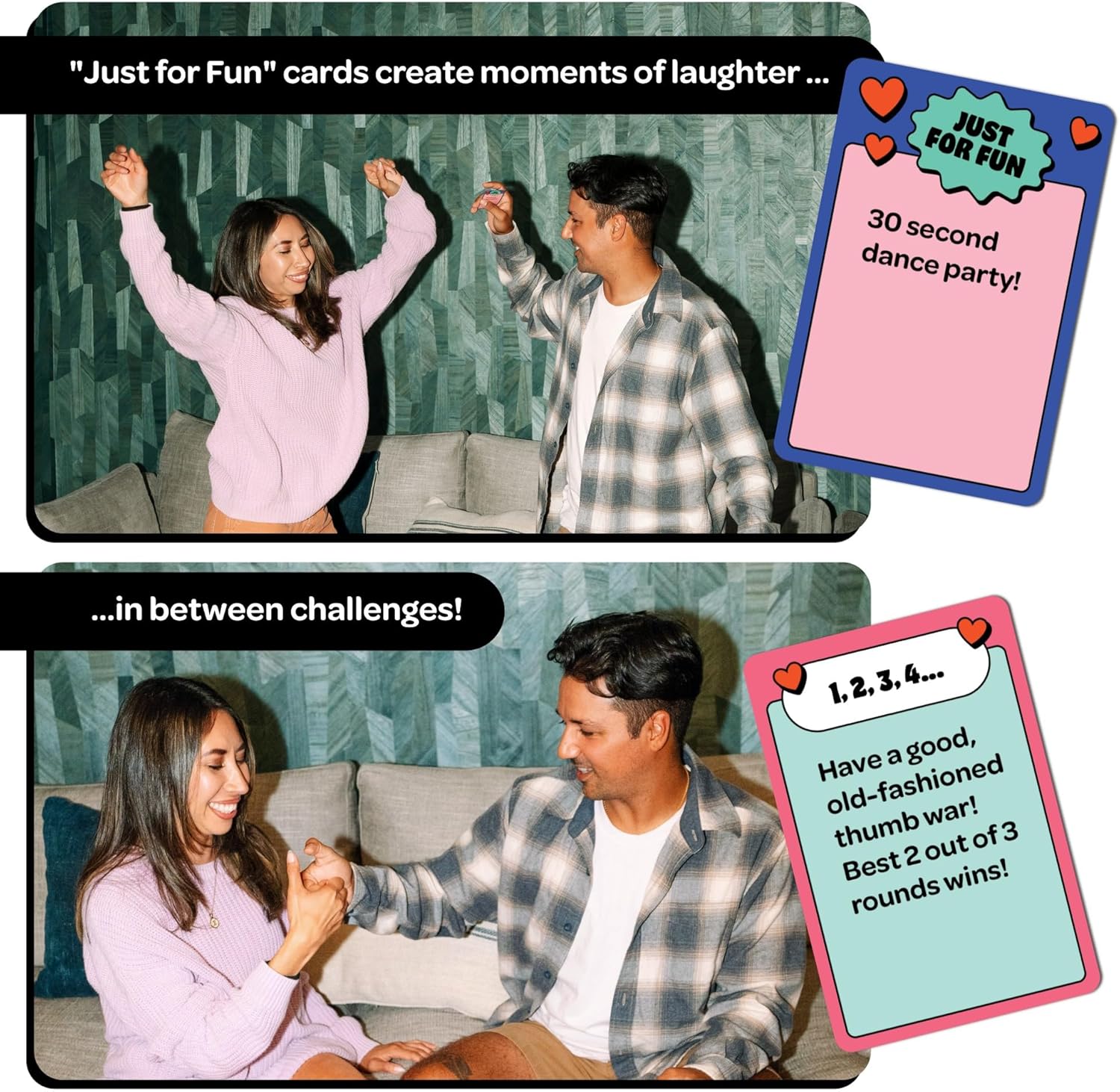- Just for fun cards: Take a break from competition with “Just for Fun” prompts that bring you closer. Think “Hug for 5 seconds” or “Give each other a pet name.” No winners, just connection.