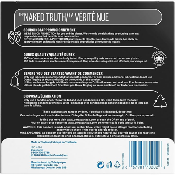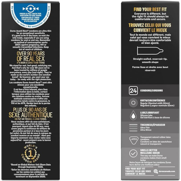 Durex Avanti Bare Condoms are ultra-thin, transparent condoms made from natural rubber latex. Each condom features a smooth shape with a reservoir tip and a regular 52 mm nominal width. They are pre-lubricated with silicone lubricant and supplied in a 12-count pack. All condoms are electronically tested, with additional quality checks conducted on each production batch. Always read and follow package directions and warnings before use.