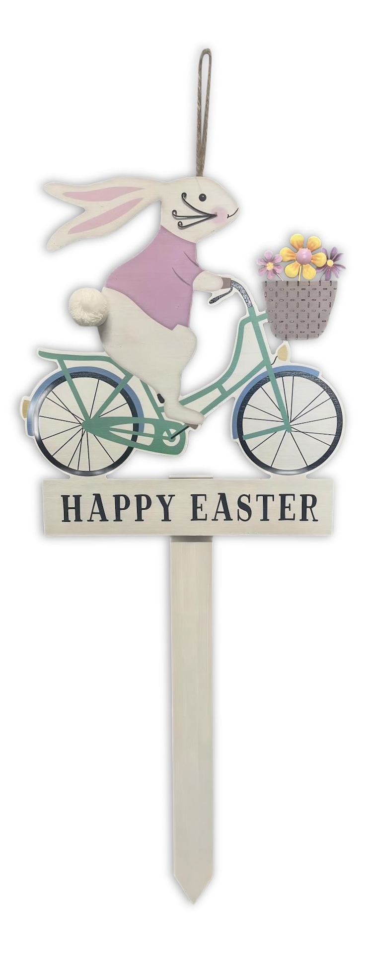 The 24-inch Easter Bunny MDF Stake features a bunny on a classic-style bicycle with the saying “Happy Easter.” Perfect for decorating your lawn and celebrating the Easter season, this garden stake captures the spirit of the holiday with its whimsical design.