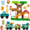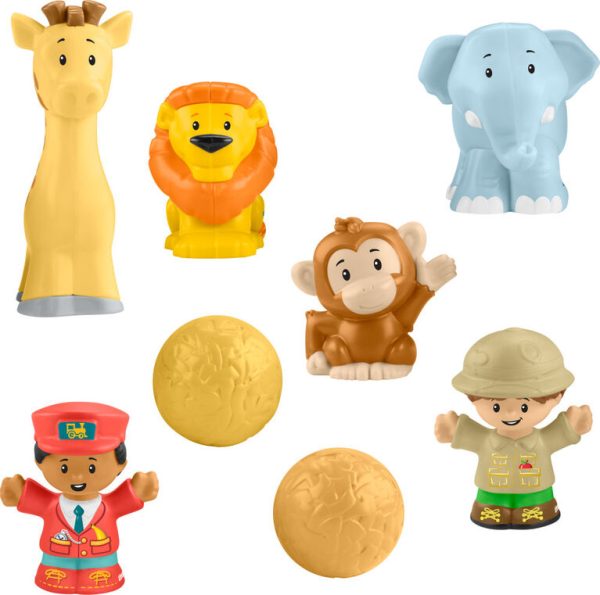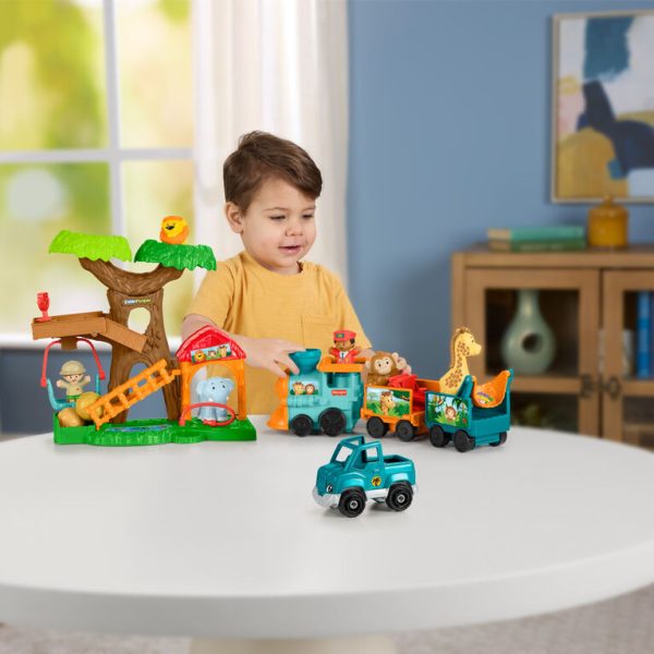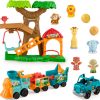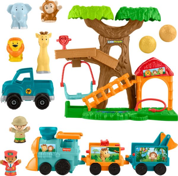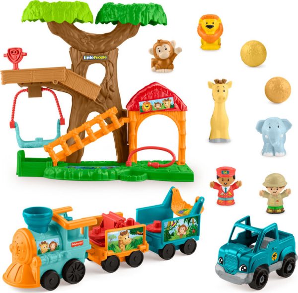 Includes playset, train with 2 detachable cars, pickup truck, 2 figures, 4 animals (lion, elephant, monkey and giraffe), and 2 play pieces