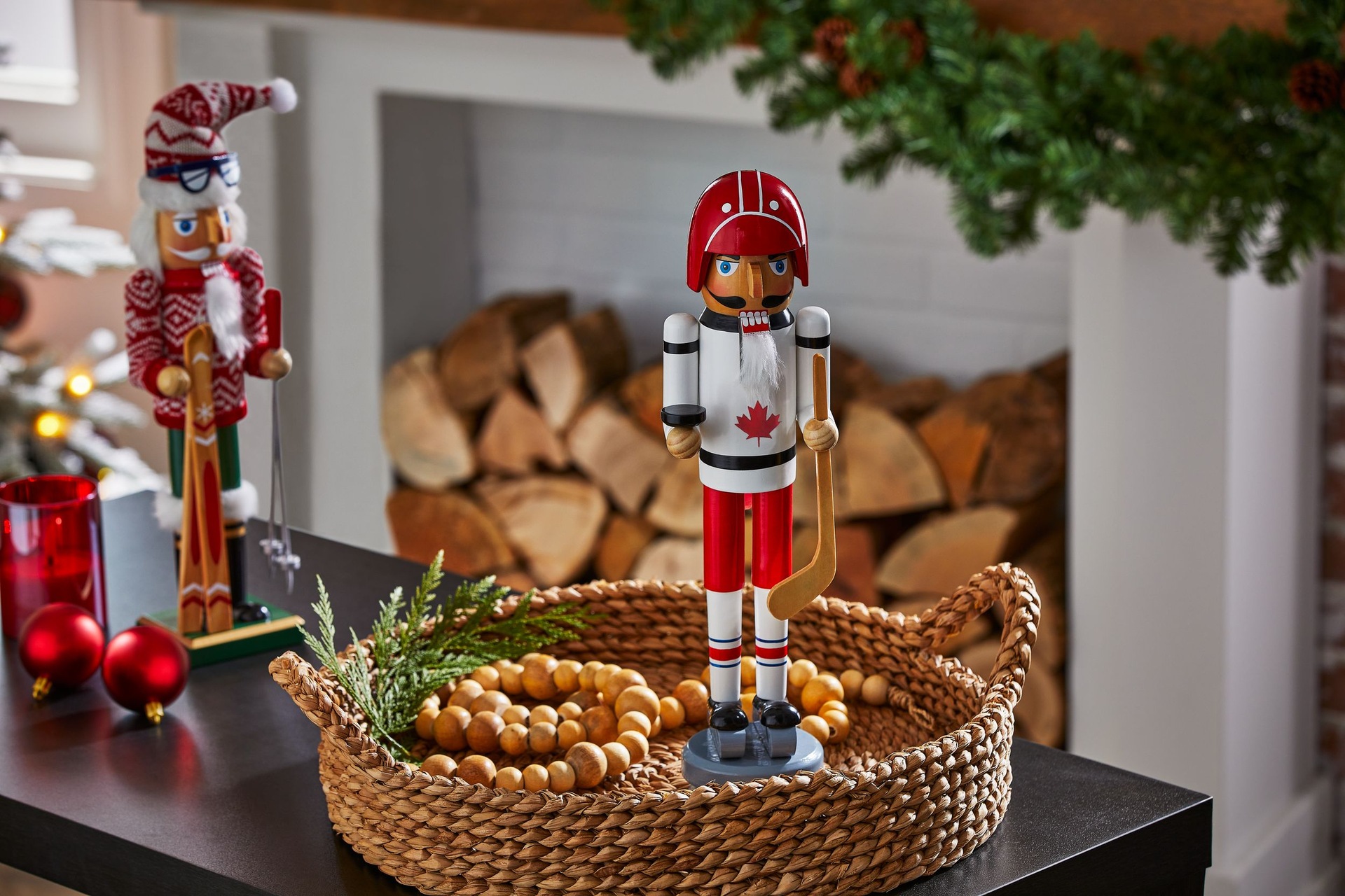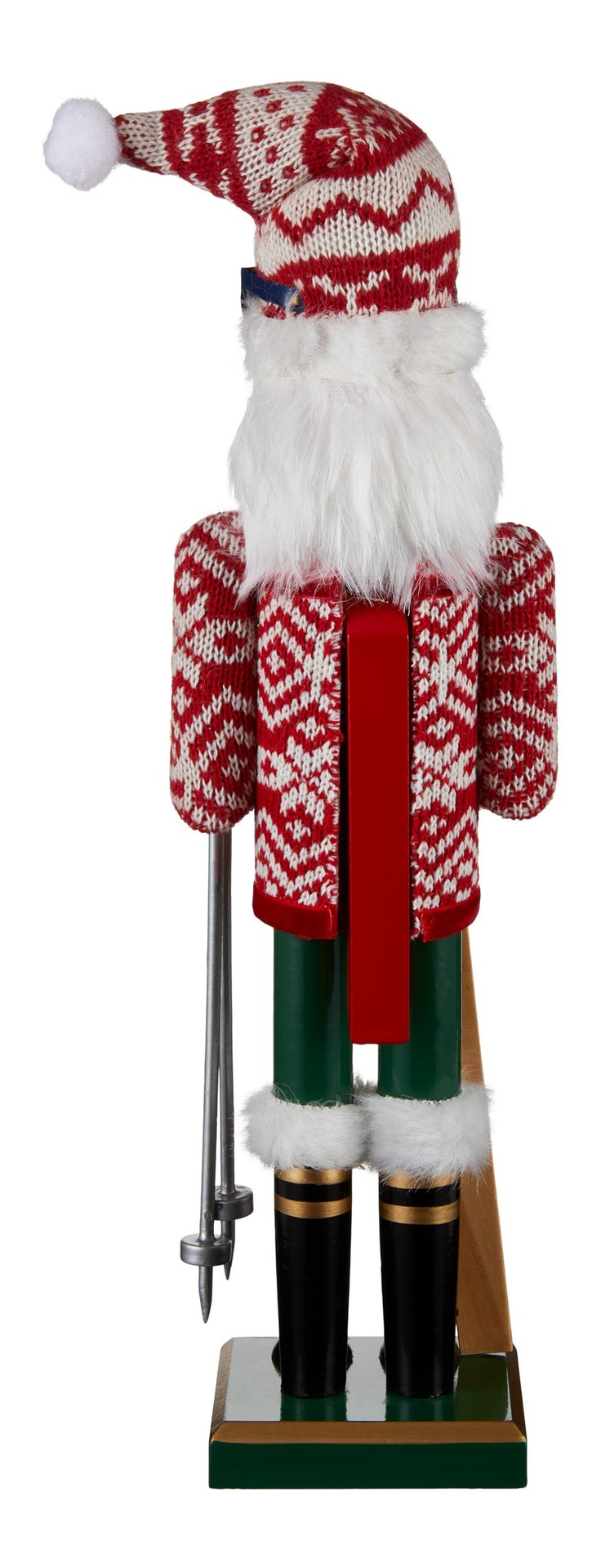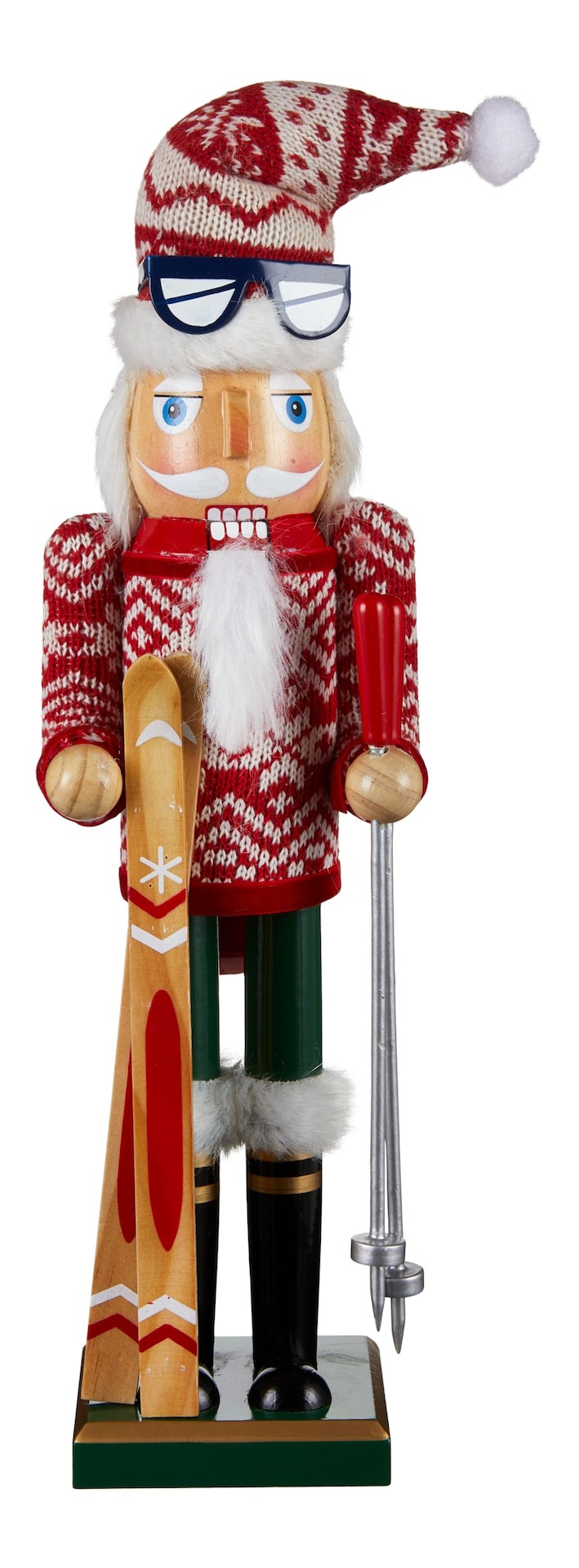 The FOR LIVING 15-in Skier Nutcracker Christmas Decoration adds a sporty twist to your décor with its alpine-inspired design. This Nutcracker is adorned with a red and white ugly Christmas sweater, a toque, ski pants, goggles, boots, skis, and poles. Fabric accents complement the figure’s carved wood body and face. With its festive winter sportsman theme, this nutcracker offers a somewhat eccentric addition to your holiday display.