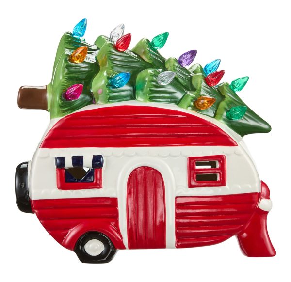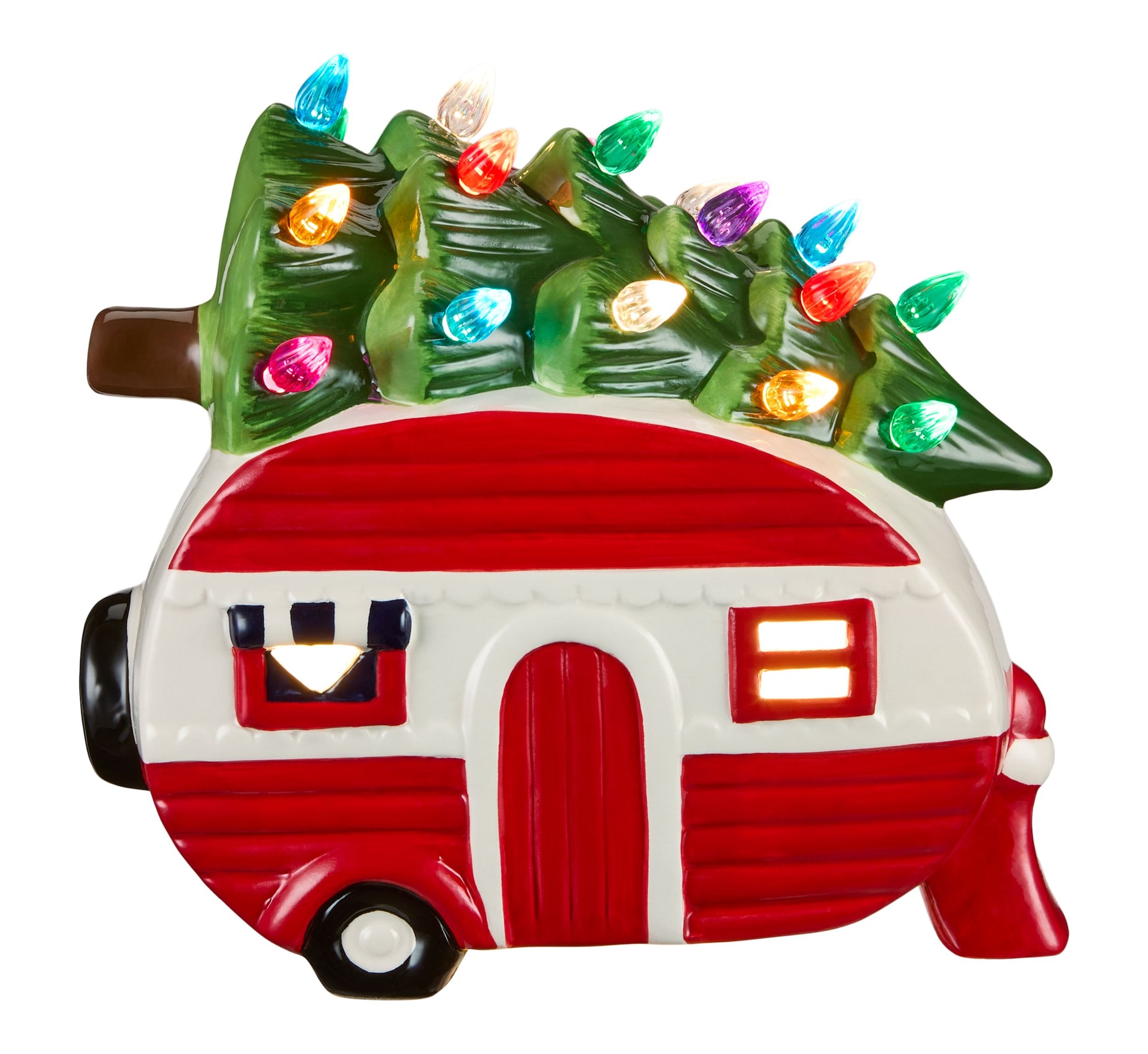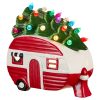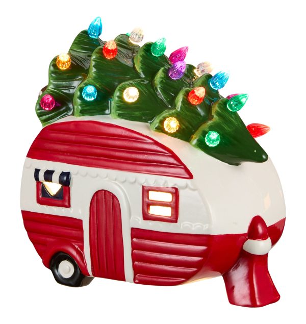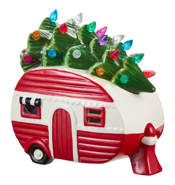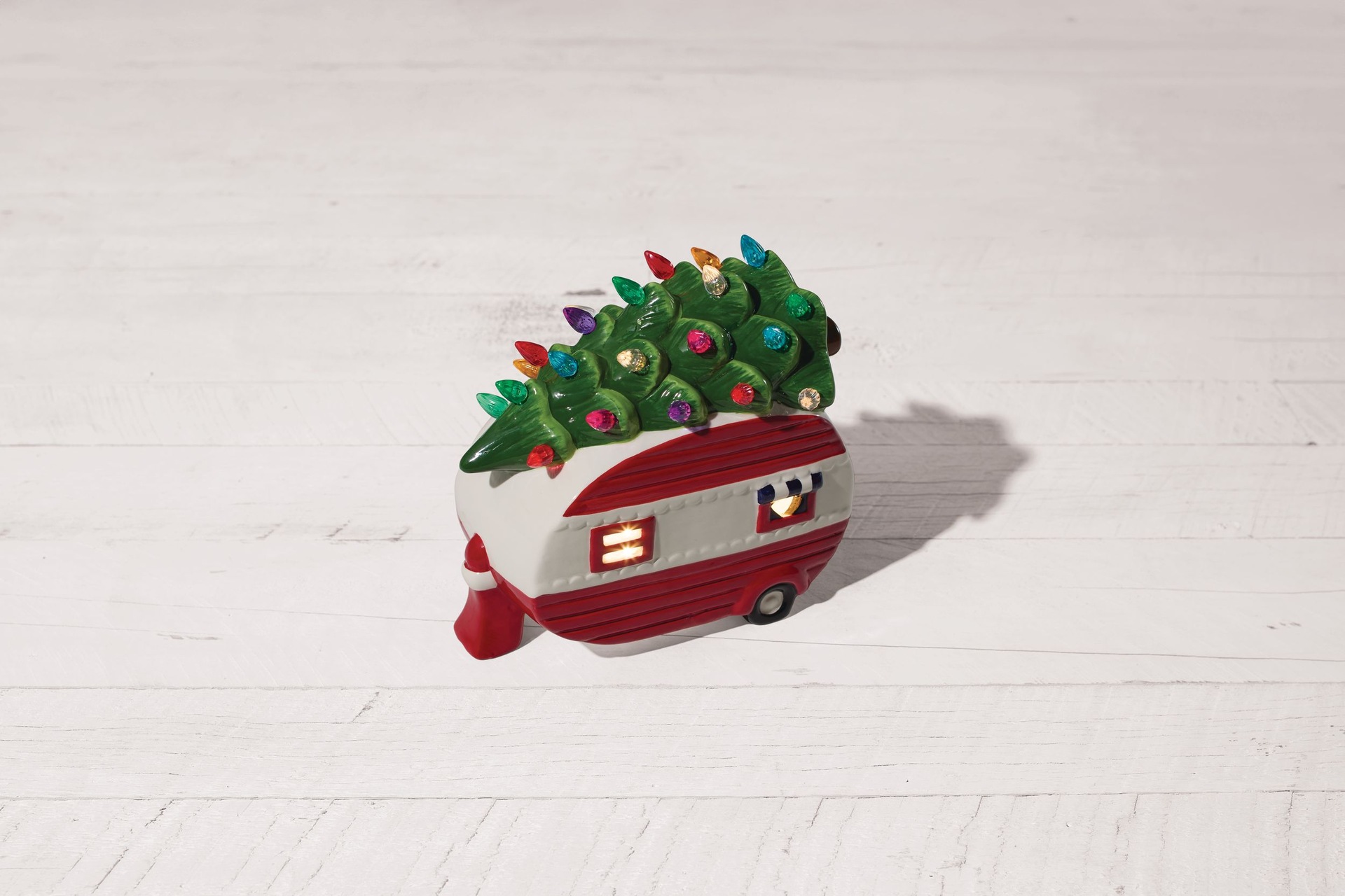 Enhance your holiday décor with the charming FOR LIVING Christmas Village Pre-Lit Ceramic Camper. This delightful piece features a festive camper adorned with a Christmas tree, perfect for adding a touch of seasonal cheer to any tabletop or mantle.