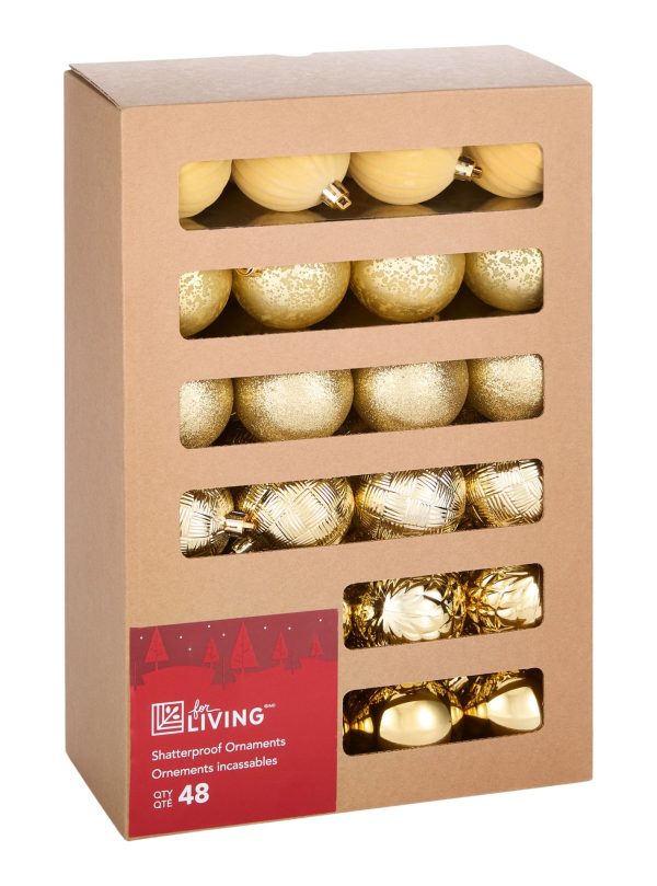 For Living Shatterproof Decoration Ball Christmas Ornament Set in Corrugate Box, Gold, 60-mm, 48-pc