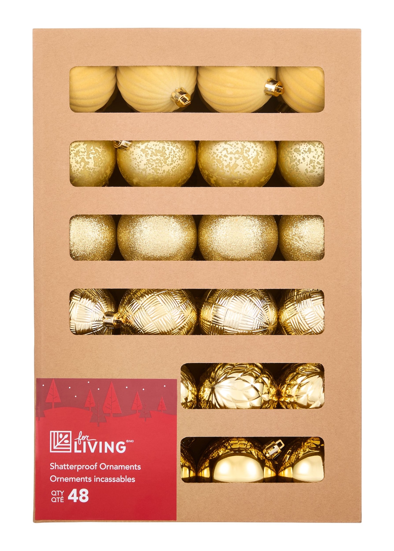 For Living Shatterproof Decoration Ball Christmas Ornament Set in Corrugate Box, Gold, 60-mm, 48-pc