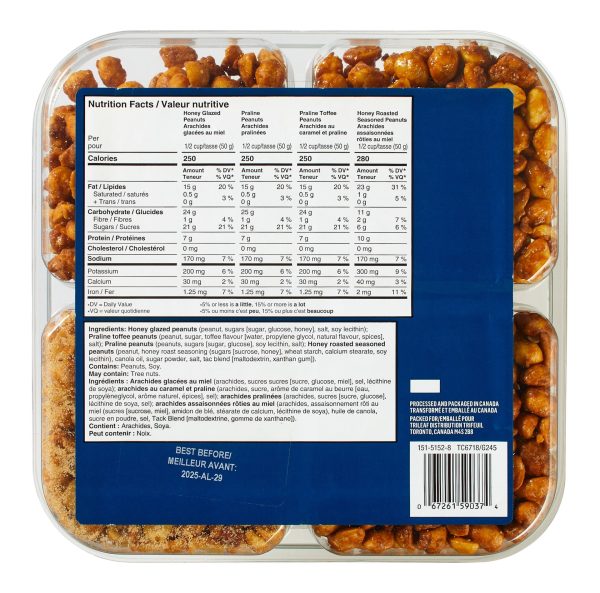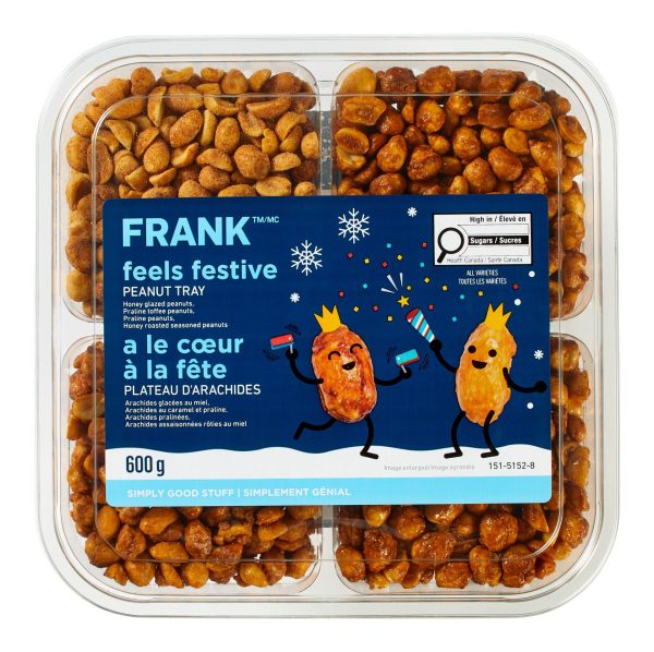 The FRANK Peanut Tray, 600-g, will get your party going. This mix of honey-glazed, butter toffee, toasted praline and honey-roasted peanuts is sure to please any peanut lover. At 600 grams, this substantial tray of peanuts offers a variety of flavours and textures to satisfy any craving. Simply open the resealable pouch and pour these wholesome nuts into a bowl for dipping, munching or topping your favourite ice cream.