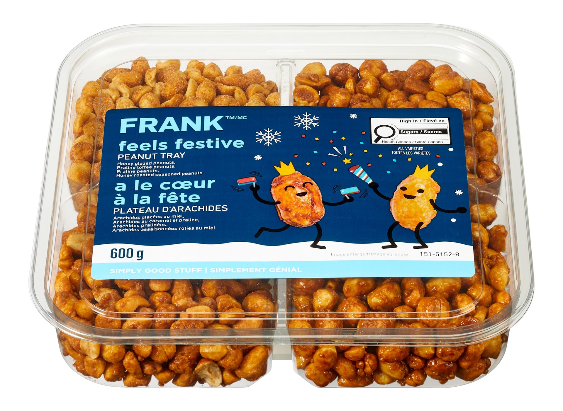 The FRANK Peanut Tray, 600-g, will get your party going. This mix of honey-glazed, butter toffee, toasted praline and honey-roasted peanuts is sure to please any peanut lover. At 600 grams, this substantial tray of peanuts offers a variety of flavours and textures to satisfy any craving. Simply open the resealable pouch and pour these wholesome nuts into a bowl for dipping, munching or topping your favourite ice cream.