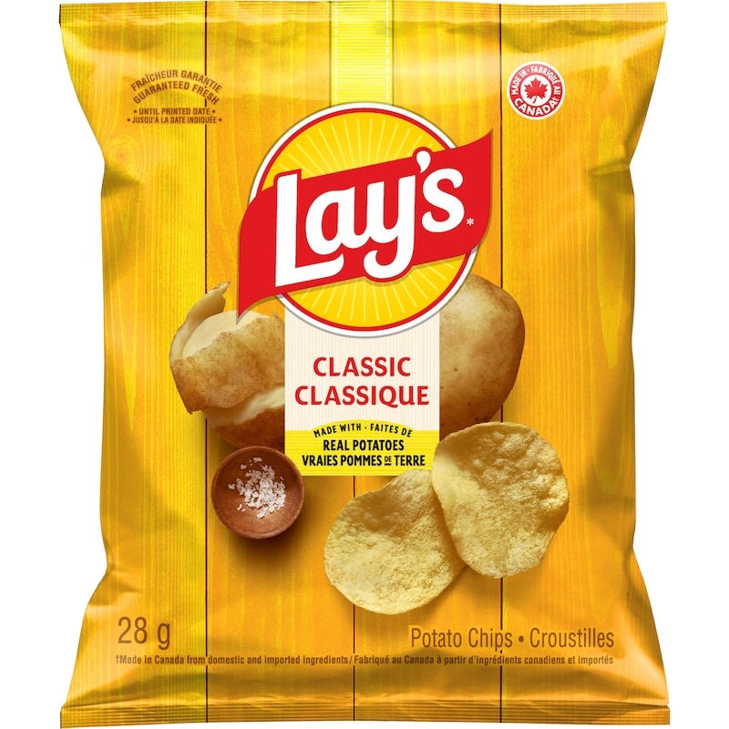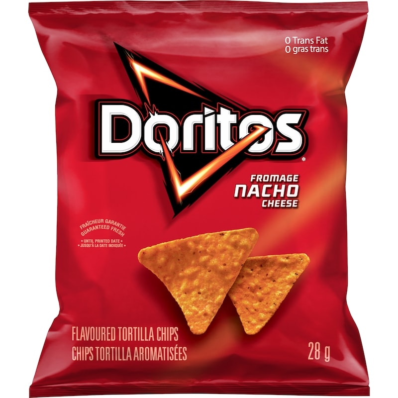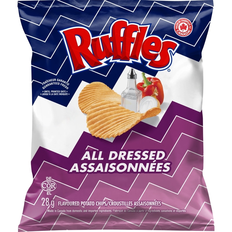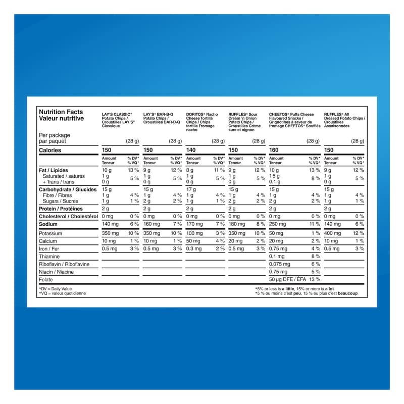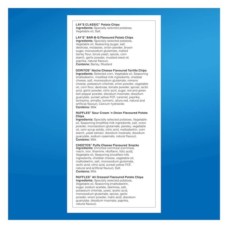 - Snack Size Bags — Lay’s Classic potato chips, Lay’s Bar-B-Q flavoured potato chips, Doritos Nacho Cheese flavoured tortilla chips, Ruffles Sour Cream ‘n Onion flavoured potato chips, Cheetos Puffs cheese flavoured snacks, Ruffles All Dressed flavoured potato chips.