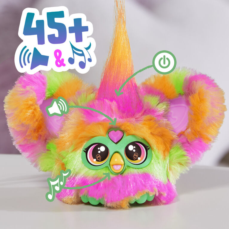 3 WAYS TO ACTIVATE 45+ SOUNDS: Press the beak for fun feeding noises and tap the heart gem for music. The top of the head powers on and off and activates fun Furbish phrases (ships in try me mode, see instructions)